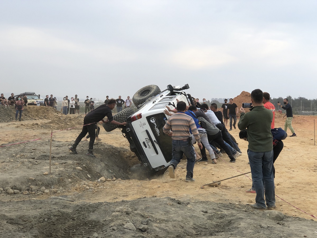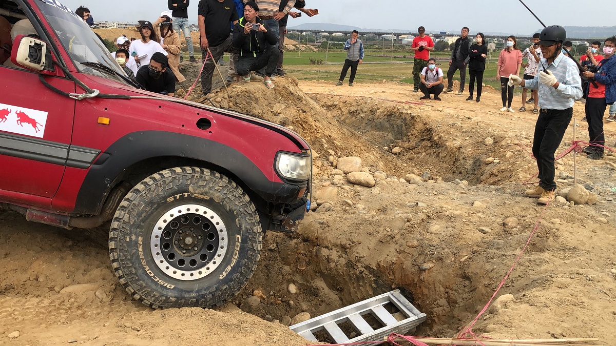 除此之外,還有單側大斜坡的障礙,駕駛如果路線選擇不好、油門控制太急,或方向盤轉動角度錯誤等,你就會看到車輛開一開就側翻了,如果側翻的角度不大的話,還可以透過觀眾的協助把車翻正繼續比賽,嚴重時只能請救援車幫忙了。