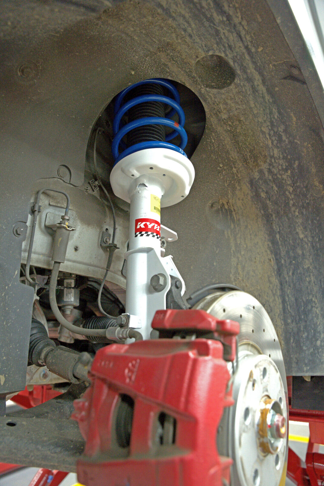 這組正式名稱為KYB Strut Plus Sport總成型避震器,整體外形如果不看顏色就跟原廠避震器一樣,差別只在於減震筒身為白色塗裝,彈簧則為深藍色塗裝,加上整組產品已組裝好避震器上座,因此才會叫做總成型避震器,換裝時只要與原廠避震器交換即可,不用進行任何車高或軟硬阻尼設定,安裝過程就跟換裝原廠避震器相同,大幅省卻安裝時間,同時確保安裝品質。