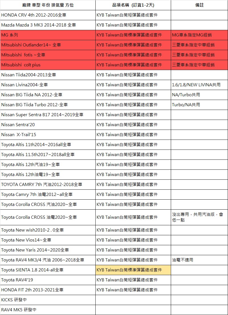 目前該款避震器在MG與三菱車系中,是指定原廠經銷據點負責銷售與安裝,至於其他車款則不受限,筆者認為能在原廠完成愛車避震器的升級工作,也是一種施工品質的保障,至於對應車種表文末有提供,多數車型都可搭配短彈簧使用,想強化愛車底盤穩定性,並適度降低車高的車主,不妨參考看看。