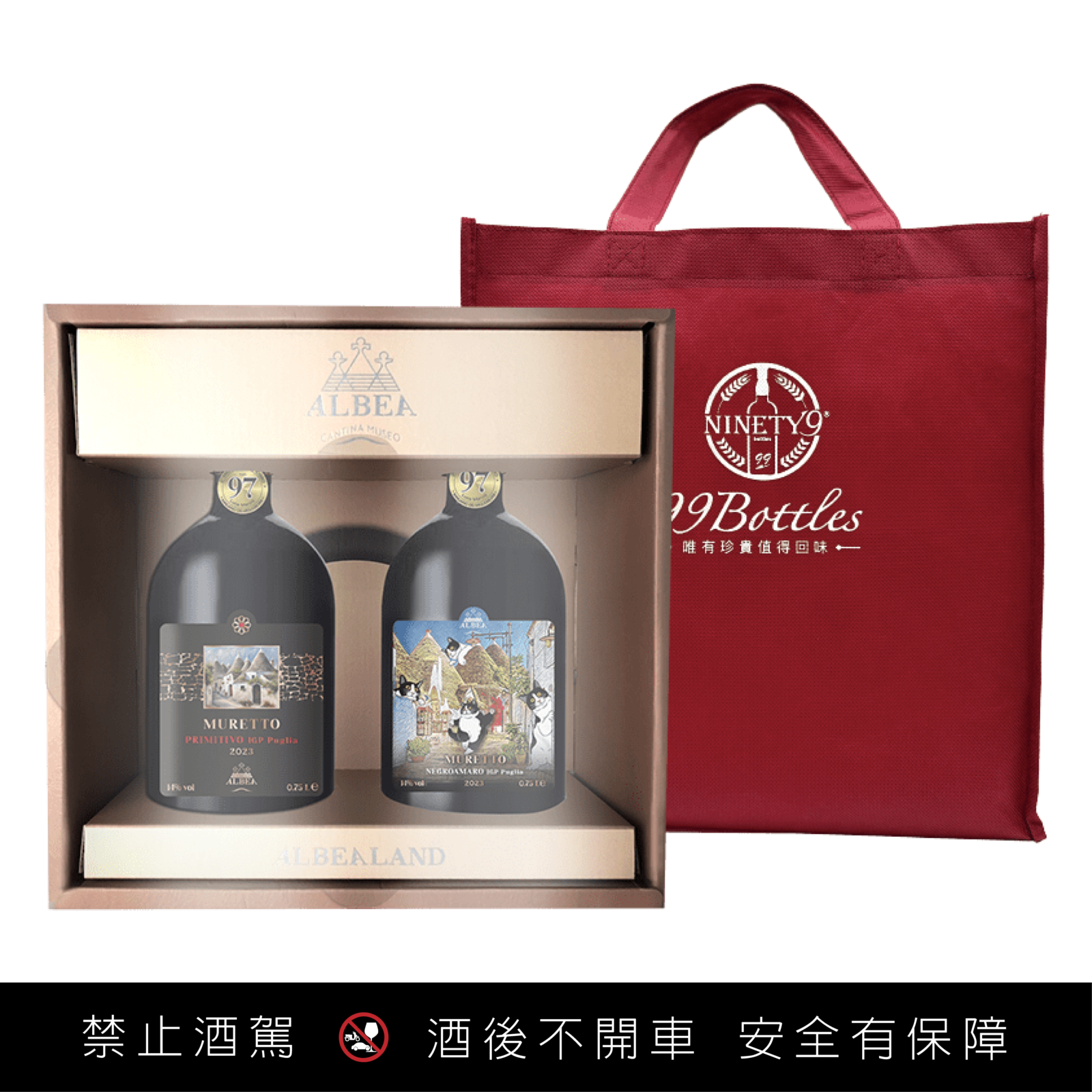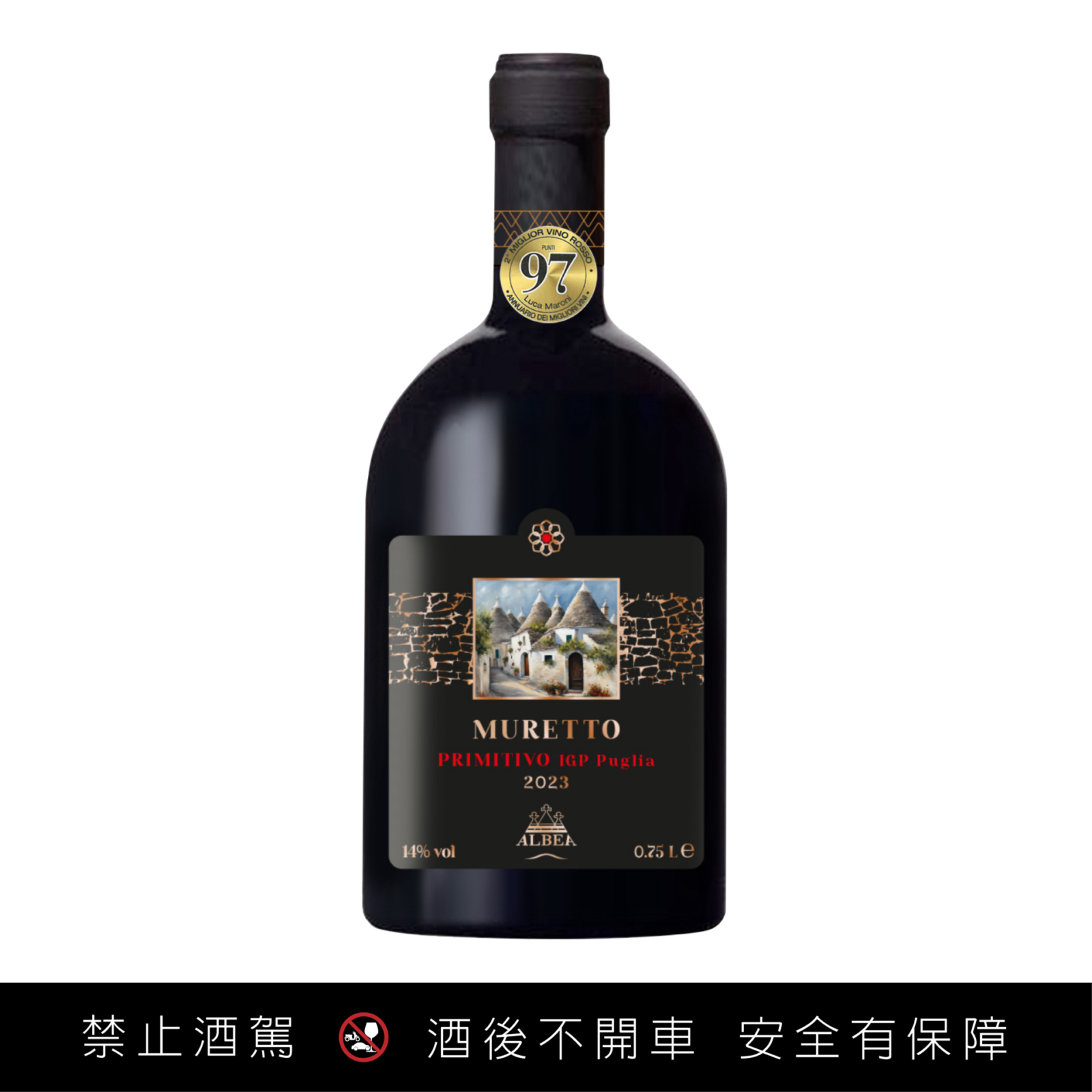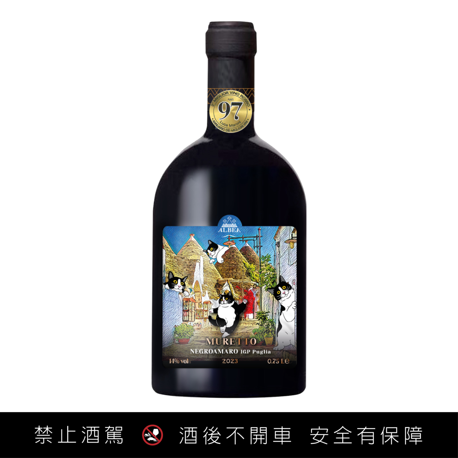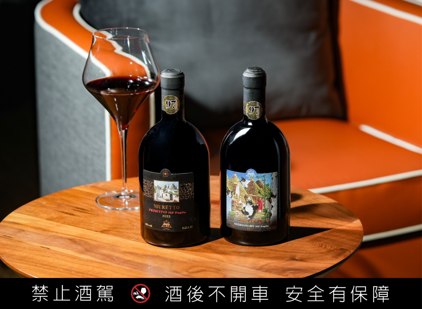 榮獲義大利酒評權威Luca Maroni 97高分肯定,這款紅酒不僅風味出色,外觀亦匠心獨具。酒標設計取材自Puglia產區,以當地標誌性「特魯洛(Trulli)」石屋為主視覺,呼應阿爾貝羅貝洛(Alberobello)古鎮的歷史風貌與手工藝精神。沉穩典雅的色調搭配金屬壓紋質感,勾勒出南義紅酒陽剛飽滿的性格,低調中透出尊貴風範。