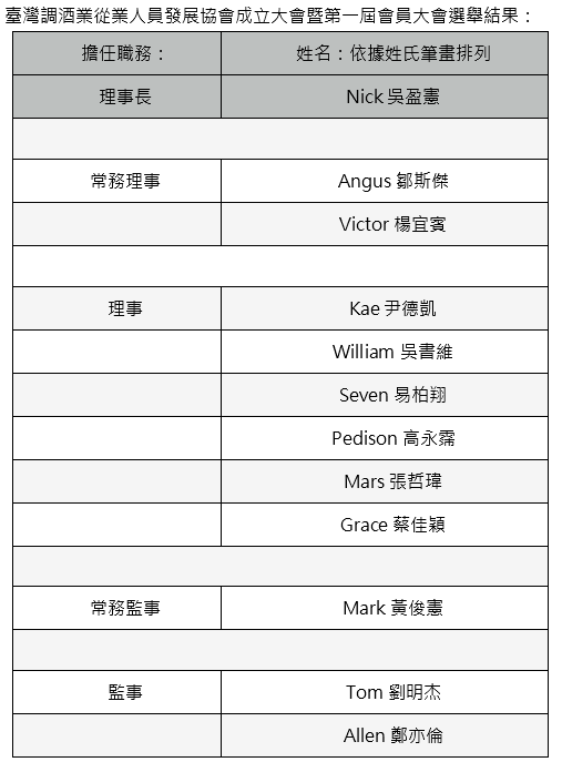 也將將定期召開會員大會與專案討論會,透過制度化共識決策推動各項產業政策與資源分配,實現產業內部健康生態與持續發展。 目前「臺灣調酒業從業人員發展協會」已籌備完成並於日前召開第一屆會員大會。誠摯邀請全台調酒相關從業人員共同參與這場產業改革行動,為台灣打造一個更穩健、有尊嚴的調酒產業未來。