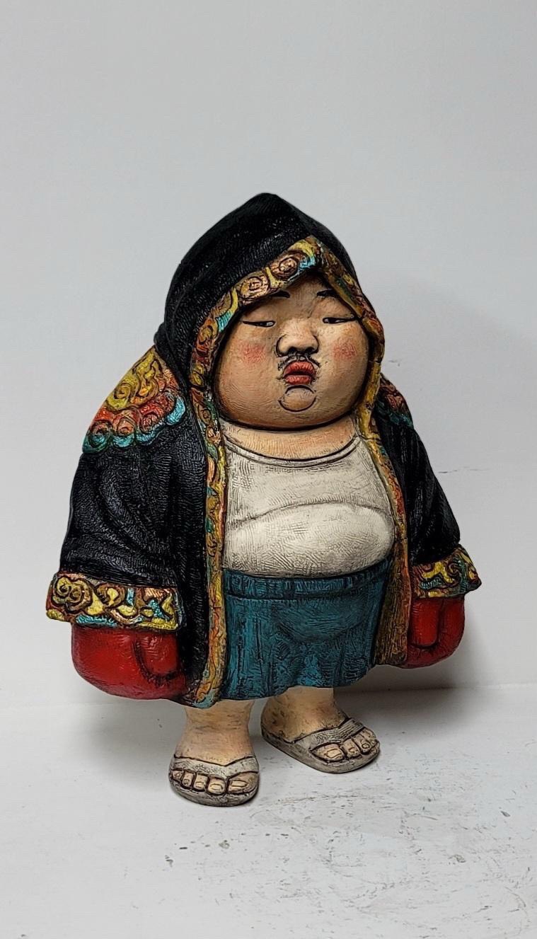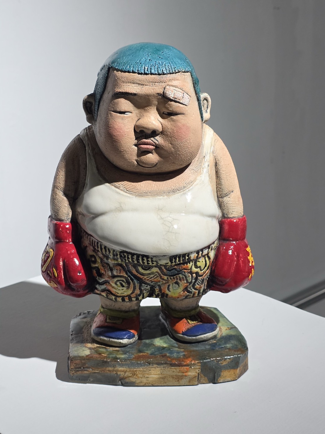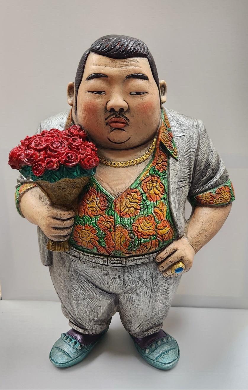 出生於1973年的金元根,來自韓國忠清北道的鄉間地區報恩郡,自幼目睹地方角頭與黑道小人物的真實生活樣貌,那些粗獷外型下藏著一抹溫柔的「硬漢」形象,成為他創作最深刻的靈感來源。他擅長透過雕塑講述故事,作品之中的大叔們多為生活不如意,卻依然心懷浪漫與童真的存在,透過圓潤的身形、緊紮的復古花襯衫、拳擊手套與花束、冰淇淋與狗狗等符碼,細膩交織出他們的生命具象。這些角色看似滑稽,卻透過細膩的眼神與情緒語法,讓觀者窺見那一絲不被輕易說出口的脆弱與悸動。