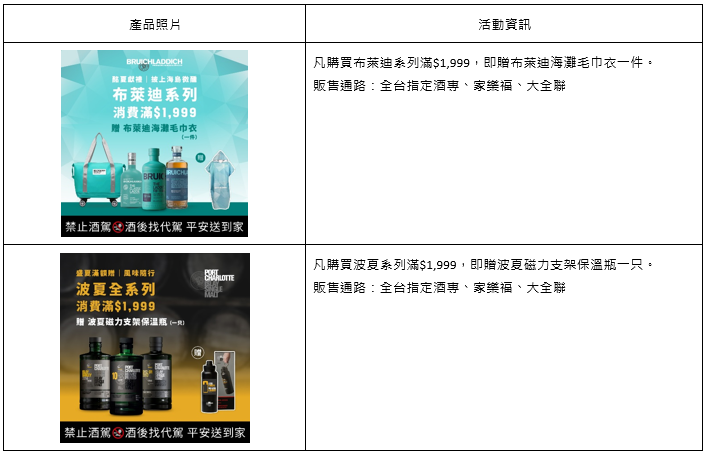 歡慶金獎肯定之餘,布萊迪酒廠更於中秋佳節之際,同步推出兩大核心品牌滿額贈活動:無論您偏好布萊迪的花果香與海鹽奶油氣息,或鍾情波夏指標性的煙燻泥煤風味,兩大系列透過精緻醇厚的酒體與豐富產品線,搭配兩款兼具實用性與設計感的贈品,帶給威士忌愛好者與眾不同的中秋風味禮品 – 購買布萊迪全系列商品滿 $1,999,即贈「布萊迪海灘毛巾衣」一件;以及購買波夏全系列商品滿 $1,999,即贈「波夏磁力支架保溫瓶」。