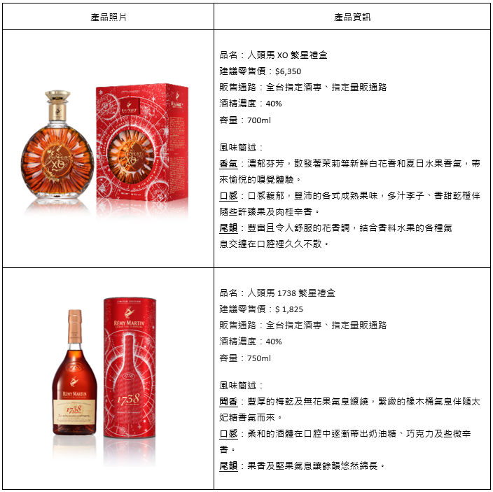 「人頭馬 1738 繁星禮盒」換上星辰紅金主題圓桶禮盒包裝,瓶身剪影與星座圖騰點綴其上,象徵著我們對美好未來的嚮往,傳達即使身處不同時空,也能與摯友在同片星空下,共同舉杯慶祝美好時光。人頭馬 1738 此酒款是紀念人頭馬於 1738 年受到路易十五國王授予的皇家認證,由百款生命之水調和而成,酒液飽滿醇順,初聞是豐厚的梅乾及果乾香氣,交織橡木桶熟成的烘焙氣息,入口綻放太妃糖、巧克力及些許辛香餘韻。無論純飲、加冰,或搭配氣泡水與果汁,皆能展現多層次的感官魅力,是送禮與相聚時刻的理想之選。