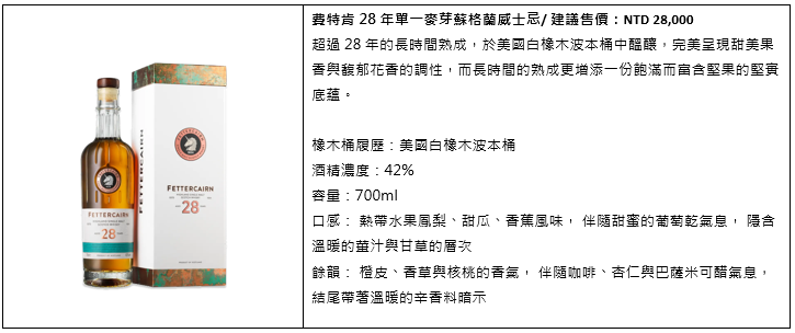 熟成於美國白橡木波本桶,費特肯28年的色澤如高地晨霧散開後第一道金光,緩釋著鳳梨、香瓜、蜜糖、香蕉的赤道風格,與一絲甘草和薑的辛香。一入口,柑橘皮的清爽在核桃和香草的圓潤中渲染開來;最後以咖啡、杏桃與若隱若現的陳醋香氣,留下一抹傳奇餘韻。Forbes 報導中評審團則形容:「它散發著烤山核桃派、巧克力堅果軟糖、酸櫻桃與水蜜桃醬、奶油餅乾及水果蛋糕的香氣;酒體如緞面般飽滿明亮,層層引出烘燕麥、焦糖布丁、蜜桃梨塔、蜂蜜乾果與印度奶茶的韻味,溫暖、繁複且極為悠長。」