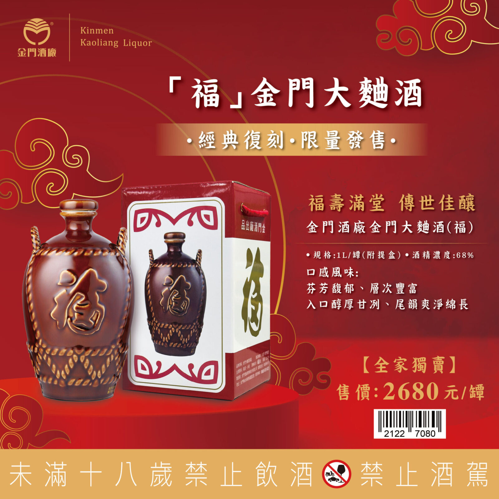 「福」金門大麯酒自2025年9月17日起,於全家便利商店FamiPort獨家預購,每罈定價NTD 2,680元,限量珍藏。