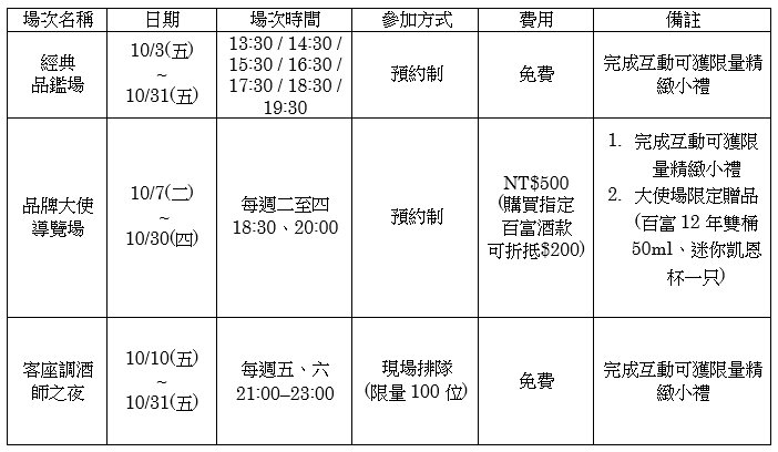 《百富豐味交饗聯名體驗店》將於10月3日至10月31日在遠百信義A13 一樓北面廣場登場,限時呈獻跨界餐酒體驗。同期間,鼎泰豐全台門市亦同步推出200ml獨家規格「百富12年雙桶單一麥芽威士忌」,讓大眾以更親近的方式感受威士忌與料理在餐桌上的風味共鳴。活動詳情與報名資訊,請見活動網站(http://bit.ly/3Wl2rzC)。