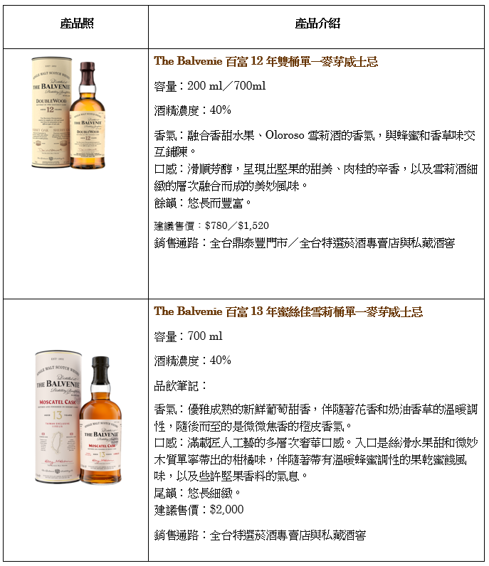 展現自1892年以來對工藝精神的持續實踐,百富始終以時間與細節凝鍊風味語彙。百富12 年雙桶單一麥芽威士忌堪稱「過桶工藝」的經典代表作,透過細緻轉化帶出香草與蜂蜜的溫潤氣息,成就品飲者心中歷久彌新的典範。而品牌大使品飲場限定登場的百富13年蜜絲佳雪莉桶單一麥芽威士忌,則是首席調酒師Kelsey McKechnie為台灣特別打造的首款作品,以馥郁花果蜜香與雅緻口感展現新世代調和思維。兩款酒在現場各自展演特色,將百富五大工藝的深厚底蘊轉化為難得的品味時刻,體會威士忌的獨特精髓。