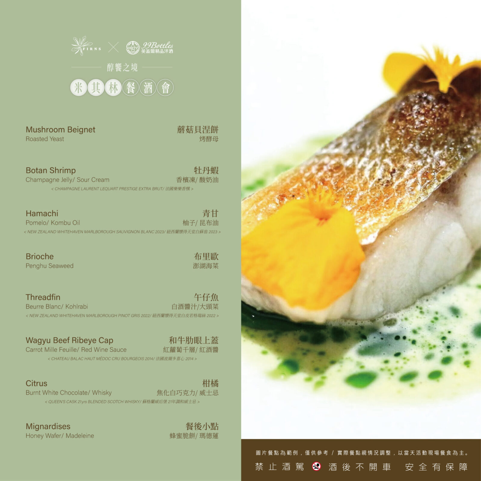 以【法國樂樂香檳PUR MEUNIER EXTRA BRUT PRESTIGE】揭開序幕,隨後由【紐西蘭懷得天堂白蘇翁】與【白皮若格瑞絲】帶出明亮果香與細膩層次,接續【法國波爾多喜心紅酒】的深邃芬芳,最終由【威后堡21年威士忌】劃下優雅句點,串起一場由清新至醇厚、層次豐富的味覺旅程。