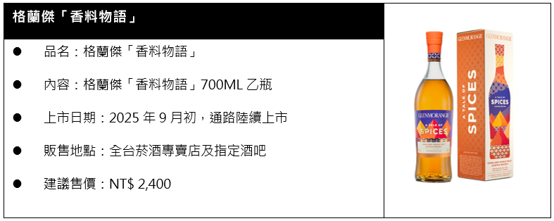 格蘭傑總製酒師比爾博士表示:「我一直都非常喜愛世界各地香料市場中所展現出的色彩與氣味的多樣性。幾年前,我與首席調酒師吉莉安・麥克唐納(Gillian Macdonald)首次嘗試使用摩洛哥紅酒桶進行實驗,我們深深著迷於這些酒桶所帶來的芬芳辛香調。在那之後,我們創造出一組不尋常的桶型配方,包括全新炙燒橡木桶、PX 雪莉桶與重新刨製再烘烤的紅酒桶,來營造一幅華麗的織錦。每一口,都如同置身香料市集的感官體驗——每轉一角,都會遇見全新的香氣與風味。從生薑、肉豆蔻與小茴香等複雜氣息,混合著略帶泥土的辛香,到甜美花香與裹著糖衣的杏仁層層堆疊,格蘭傑『香料物語』絕對是款讓威士忌鑑賞家得以盡情探索與享受的異國感官盛宴。」