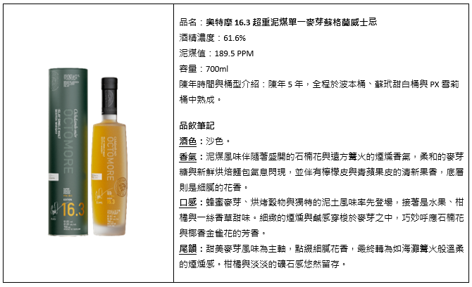 奧特摩 16.1 超重泥煤單一麥芽蘇格蘭威士忌作為系列的基準之作,泥煤值 101.4 PPM ,酒精濃度 59.3%,使用 100% 蘇格蘭本島 Concerto 大麥,酒液於初次填充的波本桶中熟成 5 年,風味呈現濃烈卻細膩的煙燻層次。入口帶有海鹽焦糖、蜜瓜與杏桃的甜香,巧克力與椰子調性細緻柔順,伴隨柔和的礦物氣息與綿長持久的煙燻尾韻。