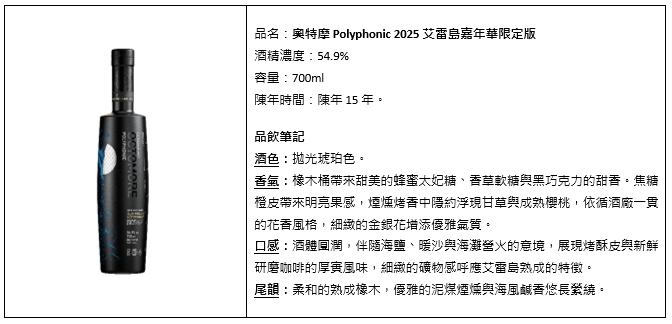奧特摩自 2008 年首度推出以來,始終堅持挑戰顛覆威士忌的傳統框架。今年 5 月布萊迪酒廠為艾雷島嘉年華隆重推出「史上最高年份」的奧特摩 Polyphonic 2025 艾雷島嘉年華限定版。獨特的奧特摩 Polyphonic 歷經 15 年的陳年,酒精濃度 54.9% ,此款酒完美融合奧特摩歷年代表作與與未曾公開的珍稀單桶,宛如一首以煙燻與甜香譜成的交響樂。香氣散發蜂蜜太妃糖、香草軟糖與黑巧克力的甜潤,入口是烤酥皮與新鮮研磨咖啡的厚實口感,尾韻伴隨海鹽與礦物氣息,餘韻悠長,是款極其稀有且讓人難以忘懷的超重泥煤威士忌。