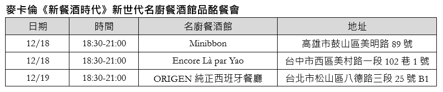 延續《為時代 創新味》精神,麥卡倫以風味串連經典與創新,不僅與北、中、南新世代名廚餐酒館自 12 月起陸續推出《新餐酒時代》品酩餐會,更聯動全台餐酒館,共譜《麥卡倫餐酒館 風味共享指南》,作為 2025 年歲末品酩聚餐首選,邀請全台酩家親身感受「精緻而不拘束、輕鬆卻很講究」的品味新章。歡迎加入麥卡倫LINE好友,即刻預購《新餐酒時代》品酩餐會:https://maac.io/4Uw0J/bYVtG