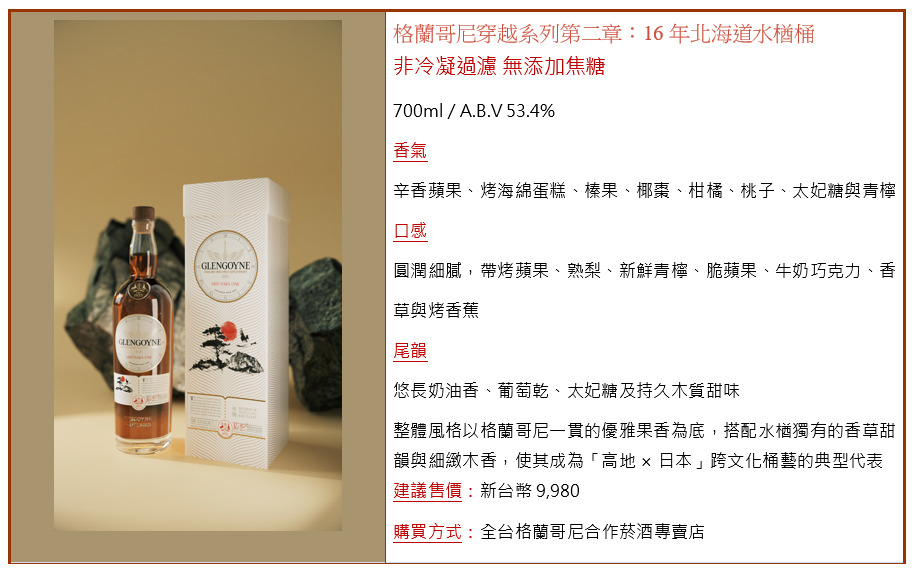 這款「格蘭哥尼穿越系列第二章:16 年北海道水楢桶」展現哥尼代表性的優雅雪莉果香、並融入水楢桶獨特的香草甜韻與細緻木質沉香,使其成為「蘇格蘭高地 × 日本北海道」跨文化桶藝的經典。包裝設計融合東方水墨畫與自然景緻意象,象徵由時間、山谷與橡木桶共同雕琢出的風味旅程。這