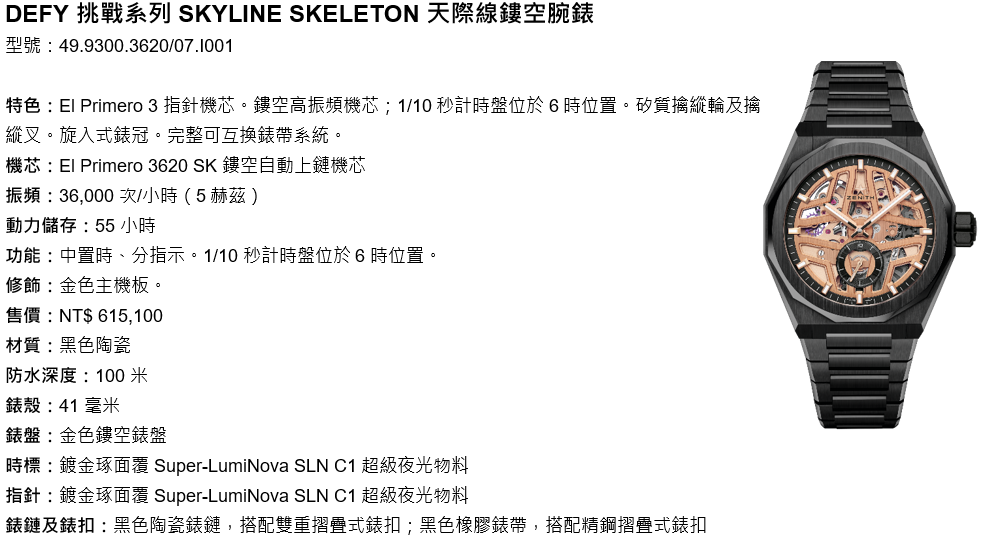 DEFY挑戰系列 Skyline Skeleton天際線鏤空腕錶於ZENITH真力時全球專賣店、官方網站線上專賣店(https://www.zenith-watches.com/zh_tw),以及各大授權經銷商發售。