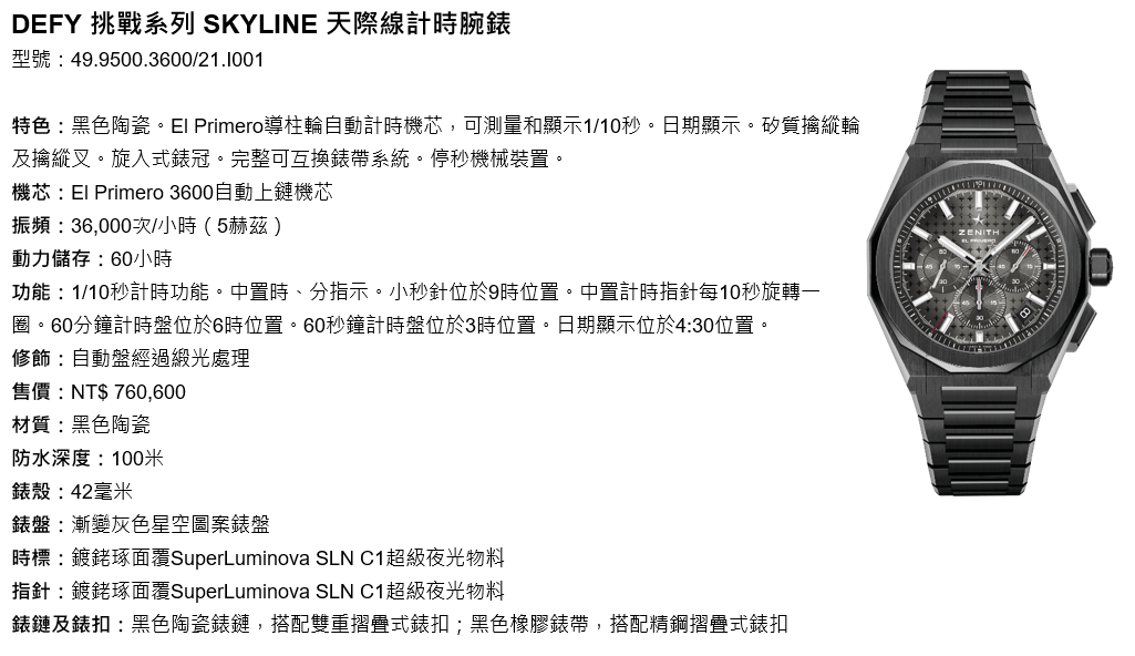 DEFY挑戰系列 Skyline天際線計時腕錶於ZENITH真力時全球專賣店、官方網站線上專賣店(https://www.zenith-watches.com/zh_tw),以及各大授權經銷商發售。