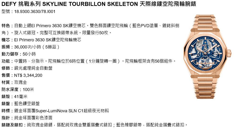 DEFY挑戰系列 Skyline Tourbillon Skeleton鏤空陀飛輪腕錶限量發行50枚,於ZENITH真力時全球專賣店、官方網站線上專賣店(https://www.zenith-watches.com/zh_tw),以及各大授權經銷商發售。