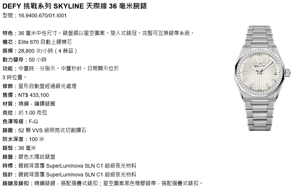 DEFY挑戰系列 Skyline 天際線36毫米腕錶銀色錶盤款於ZENITH真力時全球專賣店、官方網站線上專賣店(https://www.zenith-watches.com/zh_tw),以及各大授權經銷商發售。