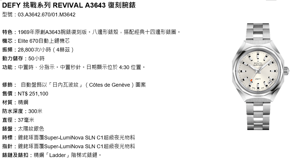 ZENITH真力時推出DEFY挑戰系列 REVIVAL A3643復刻腕錶 精準重現1969年經典設計