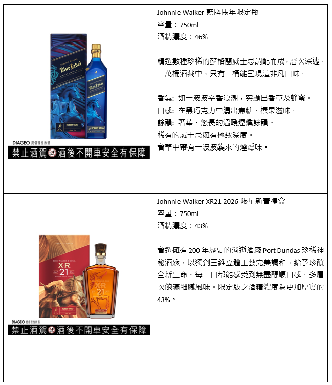 第三維度|立體調和:喚醒醞自時光的醇釀酒體,釋放果香與麥芽風味層層交織的馥郁氣息,調和出絲綢般醇厚迷人質地,完美造就平衡風味與馥郁口感。 即日起,「藍牌馬年限定瓶」與「XR21 2026限量新春禮盒」已於全台合作菸酒專賣店及量販店限量上市。迎接2026開春之際,以Johnnie Walker雙重限量精美新春禮盒,與每一口經典醇順,一同邁向嶄新的一年!