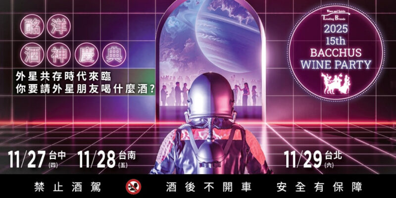 八大行星主題酒款 沉浸式銀河微醺派對酒界年度盛事2025 BACCHUS Wine Party第十五屆酩洋酒神慶典即將於2025年11月27日至11月29日在北中南三地盛大舉辦葡萄酒派對,今年以「外星共存時代來臨—你會請外星朋友喝什麼酒?」為主題,邀請全台葡萄酒愛好者共赴一場沉浸式銀河微醺派對。