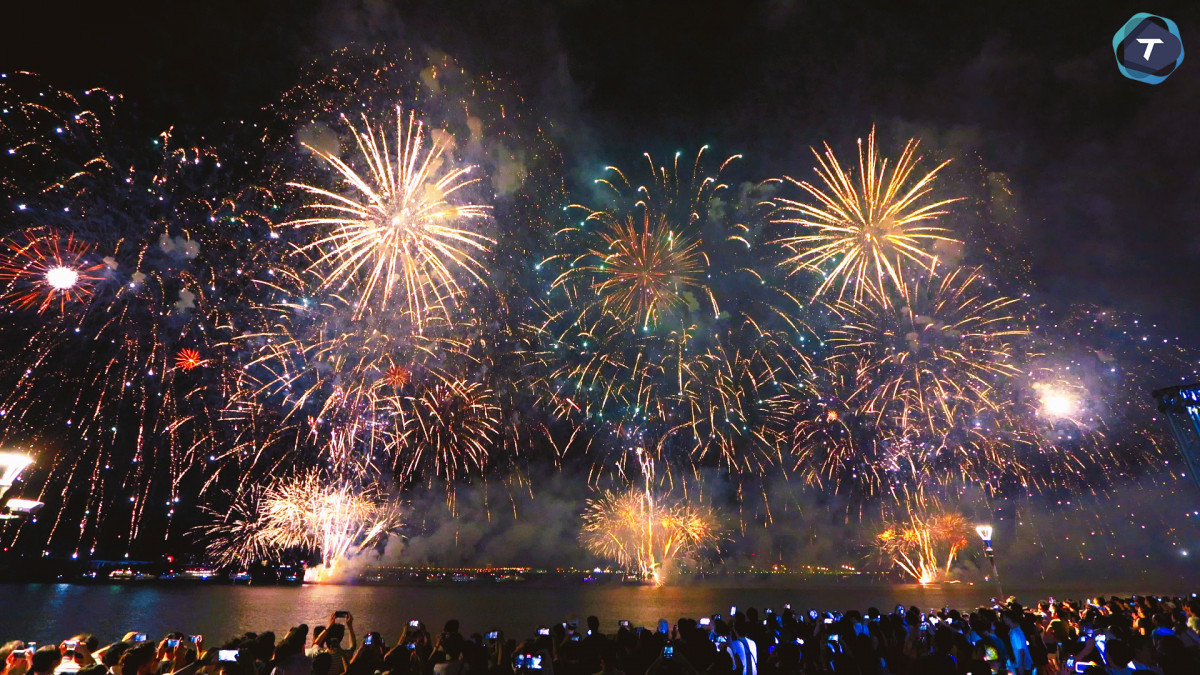 第三章「幸福誓言」: 以五彩煙雨鋪陳幸福基調,低空延展特效宛如星光誓言,最後以千輪煙火與地面菊花造型壓軸登場,宛若華麗告白,為整場煙火秀劃下最浪漫的句點。
