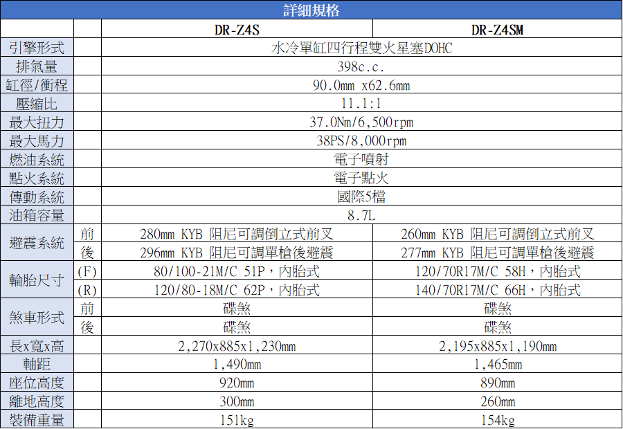 - DR-Z4S(越野版) 此次引進黃白(C1C)、鐵灰(YUD) 兩款車色。