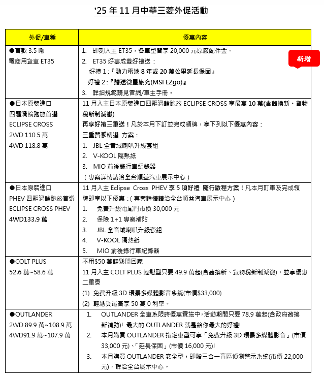 2.8人座旗艦型(CQ358)為訂作車,於受訂後45天交車。該車型後座電動窗為經銷商標準選配,保固期間為3年或10萬公里,視何者先到為準。