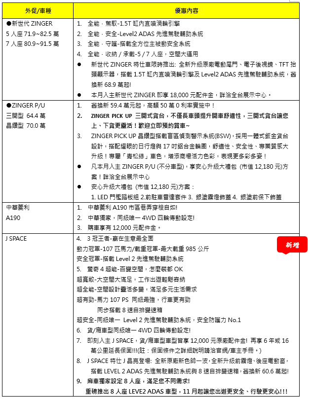 觀察自J SPACE上市以來,廂車LEVEL 2 ADAS車型的選購率超過七成,顯示LEVEL 2 ADAS大大滿足消費者對智慧輔助駕駛的強烈需求,本次全新推出之J SPACE 8人座旗艦型較尊貴型增加LEVEL 2 ADAS與後座電動窗配備超值上市,進化為國內8人座車型中最值得入手的新選擇。