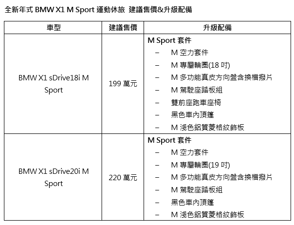 BMW 總代理汎德今(6)日正式發表全新年式BMW X1 M Sport豪華運動休旅,導入 X1 sDrive18i M Sport 與 X1 sDrive20i M Sport 兩款車型,建議售價分別為新台幣 199 萬元 與 220 萬元。