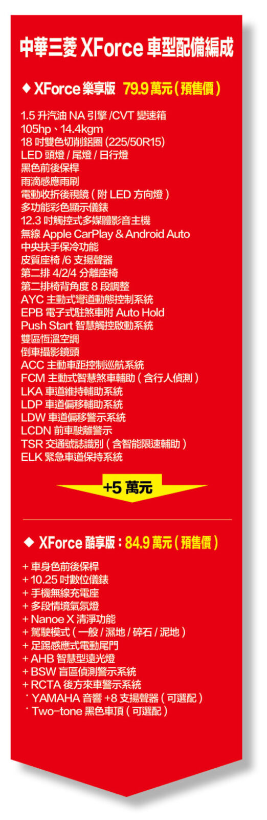 ●新車預售價 XForce樂享版:79.9萬元、 XForce酷享版:84.9萬元