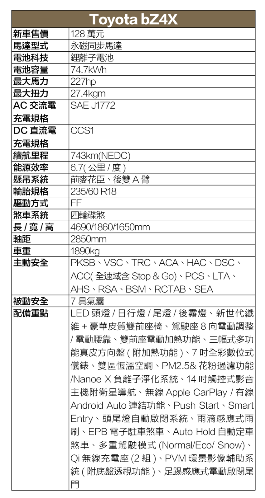 這次所導入的小改款bZ4X,仍維持單一前驅單馬達動力車型編成,新車售價為128萬,與先前售價相比有著8萬元的調降,親民度可說提升了不少。而此次小改款bZ4X,除了擁有煥然一新的車頭樣貌以及內裝設計之外,在配備上也向上升級,但最大的變革就是換上更大容量的74.7kWh電池組,不僅讓動力更加提升之外,也讓純電最大續航里程從原有626km一舉增加至743km(NEDC),能有效降低所謂的里程焦慮,同時升級的e-Axle電驅系統亦帶來更出色的耗能表現。