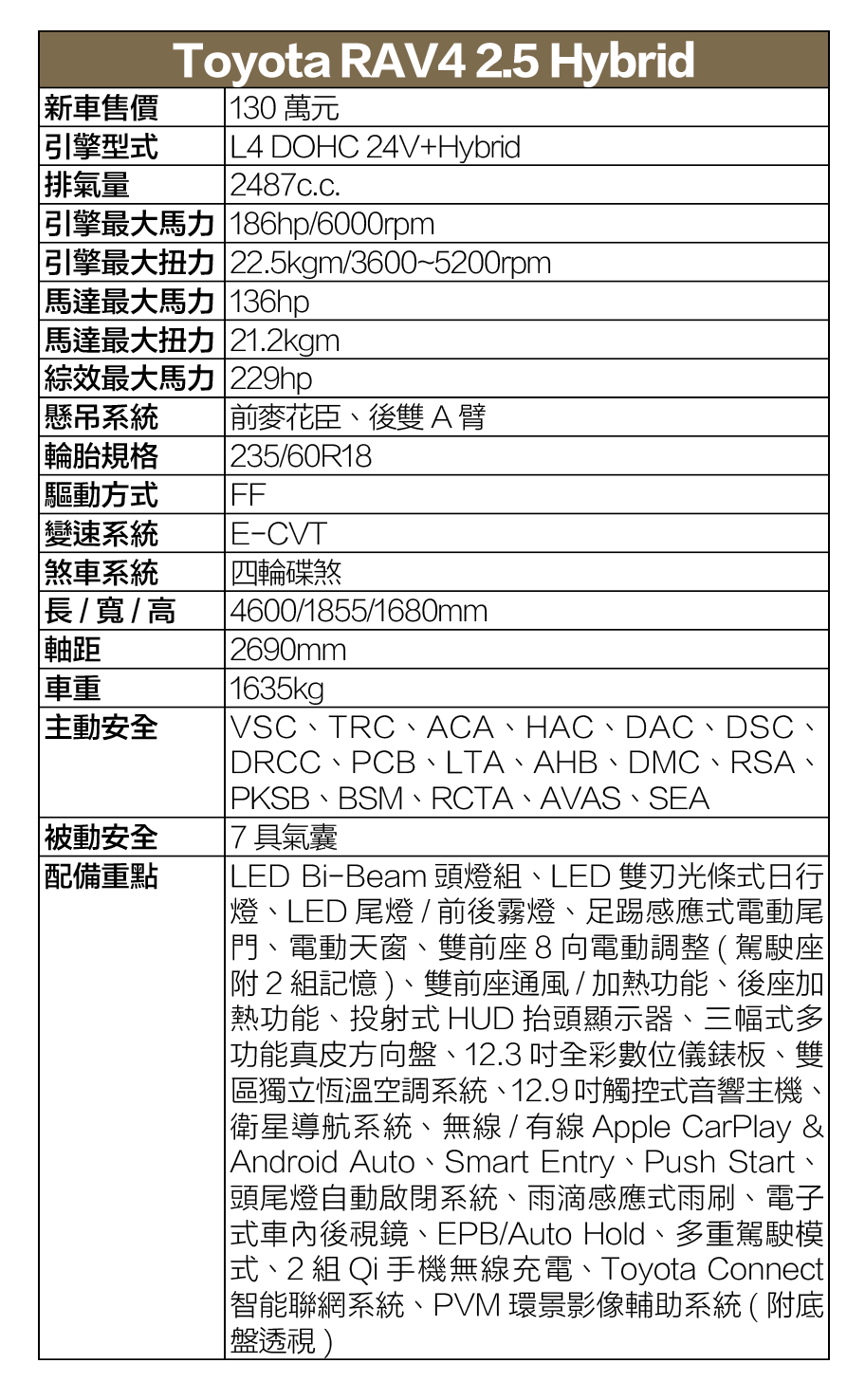 動力表現方面,這次首波導入的RAV4車系,皆搭載全新第5代2.5升Hybird油電動力系統,並搭配E-CVT變速系統,引擎本體代號為A25A-FXS的2.5升直 4自然進氣引擎,可輸出186hp、22.5kgm最大馬力及扭力;此外,前驅旗艦版所採用的永磁同步馬達則可釋放136hp、21.2kgm最大馬力及扭力,再搭配體積更小、且經強化散熱與輸出效能的新型鋰電池模組,使其最大綜效馬力輸出由 218hp增加為229hp,同時平均油耗也從22.6km/L提升為24km/L。