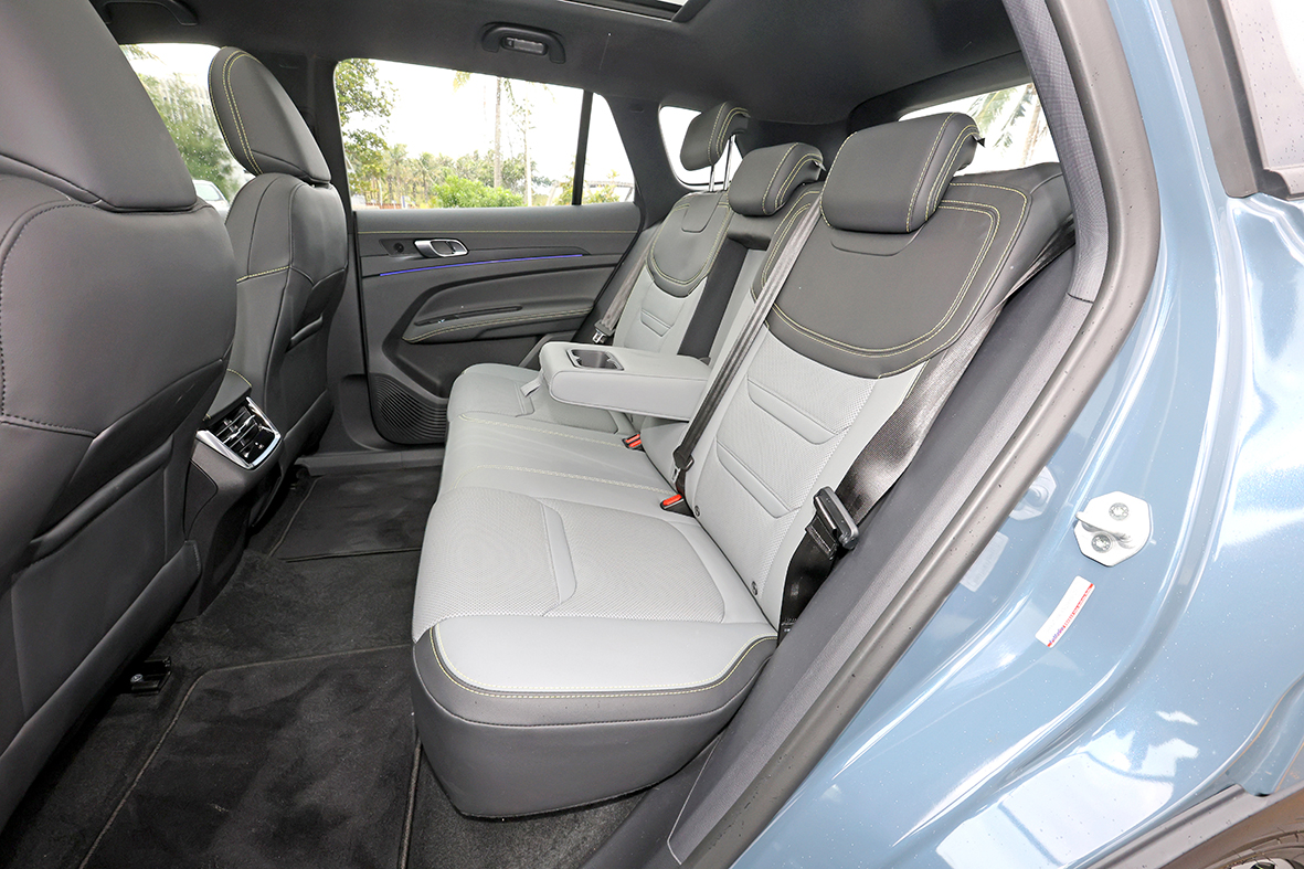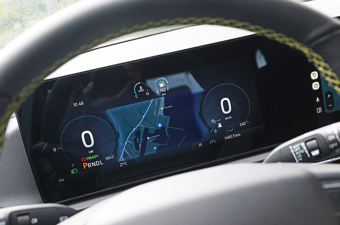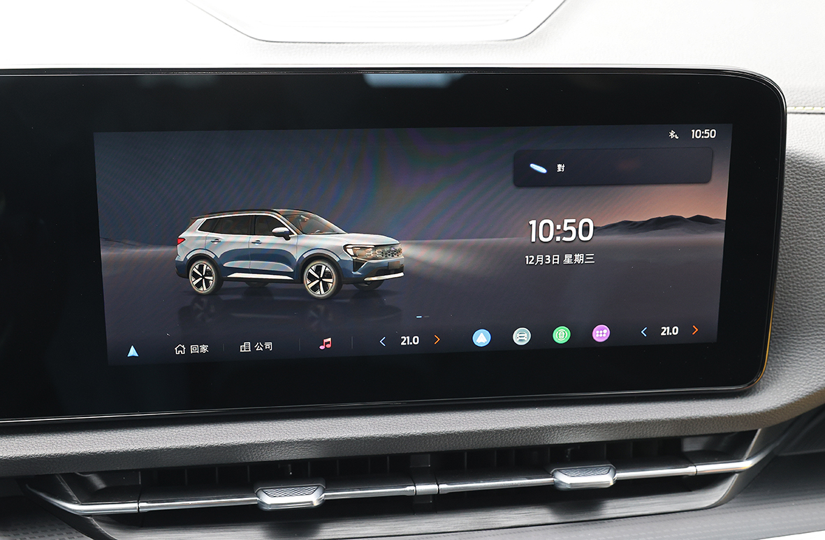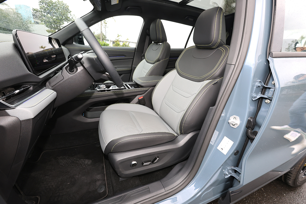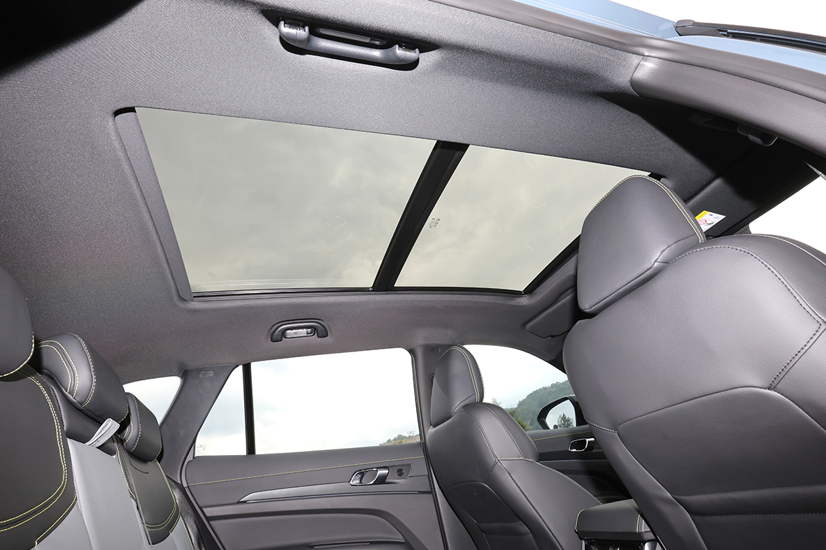 車艙部分,Territory走的是大器簡潔的風格路線,且包括控台、中央鞍座以及前後門飾板等處,皆包覆軟質塑料再搭配皮革以及鍍鉻金屬件與黑色鋼琴烤漆飾板等,尤其座椅更以PANGEA頂級真皮打造,讓整個車艙展現出高端的質感氛圍。此外,針對油電車型更加裝有專屬雙色內裝套件,以晨曦灰/迷霧黑為基調,搭配Tech Matrix科技矩陣紋飾板以及特殊的Zest琉光綠縫線,透過運用現代且輕盈的和諧色調,再點綴清新的色彩於其中,帶來舒適自然又活潑的車艙氛圍,尤其雙前座更提供有電動調整(駕駛座10向)與多段數可調的通風座椅功能,鋪陳自在愜意的頭等艙級的乘坐享受。