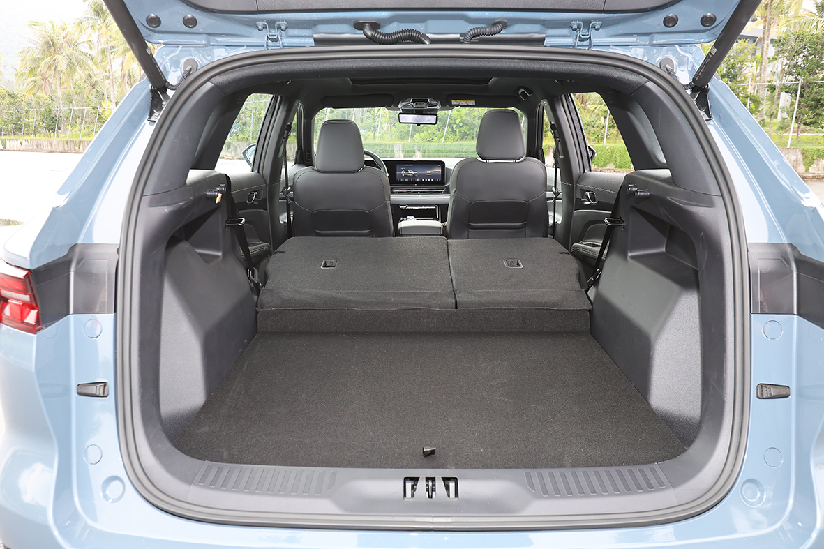 全新Territory在具備4,685/1,935/1,706mm車身尺碼以及2,726mm軸距的先天優勢下,而奠立了「全席無壓宇宙艙」空間基礎,進而創造出如L-SUV般的越級舒坦大空間。以雙前座來說,除座椅的乘坐舒適性表現出色外,也加上實用的電動調整與通風功能;而後座在175cm成人實際乘坐下,膝部與頭部空間還分別擁有約2.5個與1個拳頭距離,不僅寬敞度非常好,乘適性也佳,尤其受惠於達1935mm的車寬,更帶來十分寬廣的橫向空間表現,即便滿載3人也不會發生摩肩擦踵的情況,再加上後座底板採平整化設計,不僅讓進出更為方便,更提升乘坐時的腿部舒適性表現。另外,後行李廂空間除相當寬大之外,其行李廂開口寬度更達115cm,搭配採6/4分離機制的後座向前傾倒之後,可放入75吋的超大電視,搭配全車共達22處靈活收納空間以及具備足踢感應式的電動尾門等多項貼心設計,無不呼應「為家庭打造」的開發理念。
