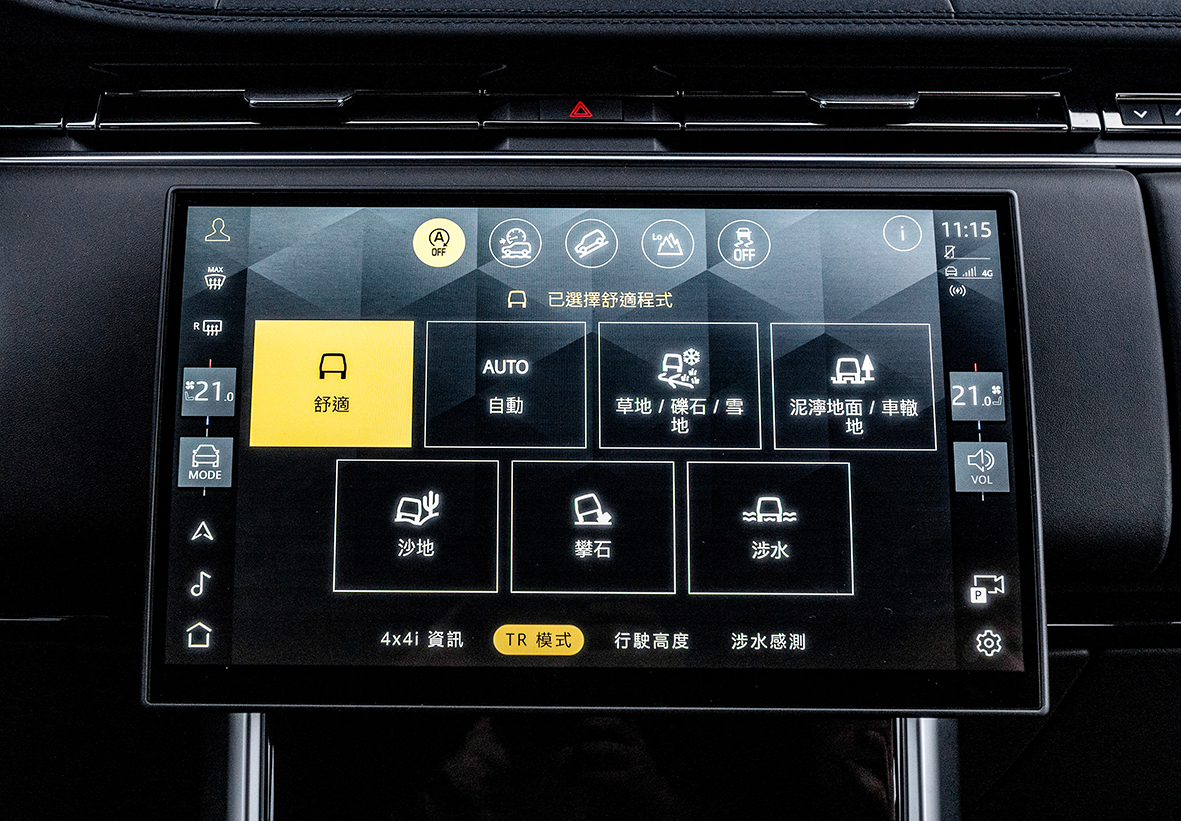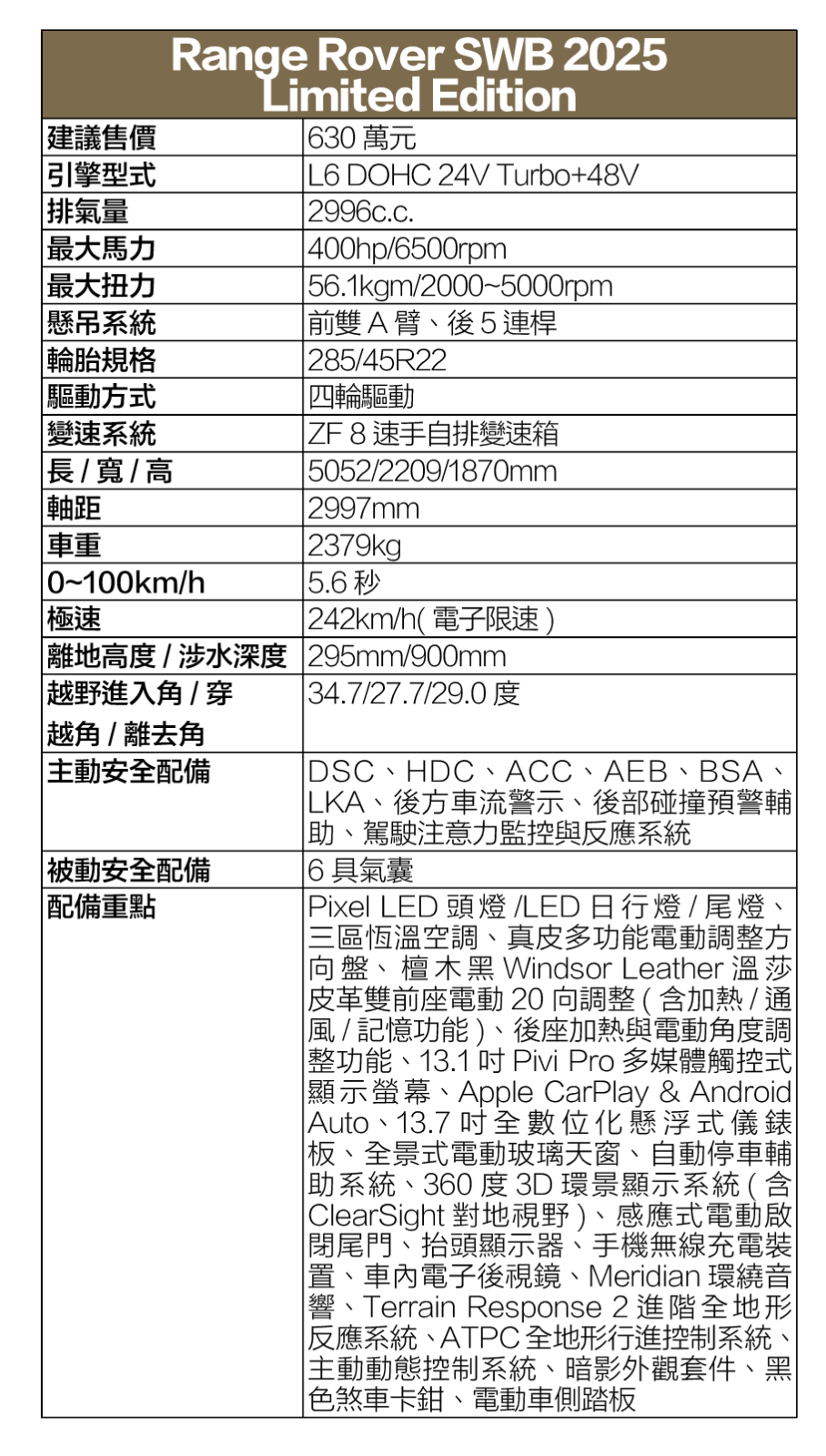 在內裝部分則延續外觀設計風格,以檀木黑的內裝為基調,再搭配檀木黑車內頂篷、尊貴黑飾板,以及採檀木黑Windsor leather溫莎皮革所包覆的全車座椅,為整個車艙營造出既奢華又充滿個性與沉穩風格的高質感氛圍。除此之外,包含13.7吋全數位儀錶以及搭載最新Pivi Pro車輛資訊娛樂系統的13.1吋曲面玻璃觸控螢幕主機,還有具備20向電動調整與通風/加熱/記憶功能的雙座椅與同樣擁有加熱、通風與電動角度調整功能的後座椅,也一應俱全地在此車的標配項目中;其他諸如三區恆溫空調、多功能電動調整方向盤、全景式電動玻璃天窗、自動停車輔助系統、360度3D環景顯示系統、抬頭顯示器、手機無線充電、車內電子後視鏡以及Meridian 400W環繞音響等,甚至是先進的Terrain Response 2進階全地形反應系統、ATPC全地形進階控制系統、電子氣壓式懸吊以及電子中央差速器等越野利器也都沒缺席。