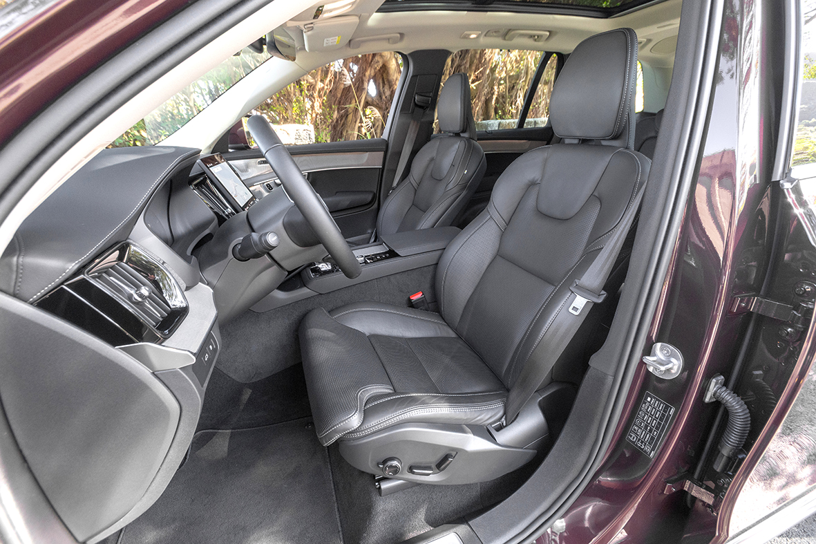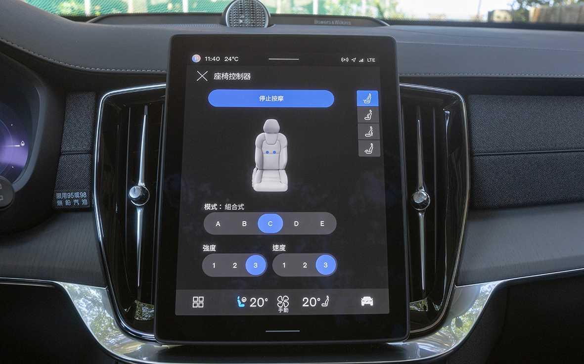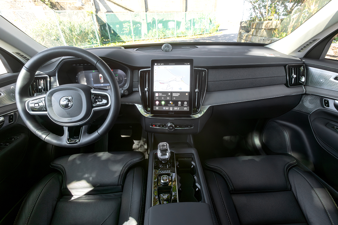 內裝鋪陳格局部分也同樣與B5 Plus相同,差異處僅在環艙飾板材質的不同運用,以及左右門飾板上方因應Bowers & Wilkins高級音響的配置,其喇叭處乃採用視覺感受更強烈的金屬飾蓋設計等;不過為了更加突顯其頂規車型的尊榮,原本在B5 Plus車上的Nordico透氣植然皮座椅,則改換成質感更細膩的Nappa透氣真皮舒適型座椅,且這雙前座除了具備多向電動調整/加熱/通風/記憶功能之外,也增添了獨有的背部側邊支撐靠墊(附電動調整)以及擁有5種模式設定的背部按摩功能,給予乘員更加舒適放鬆的乘坐感受,這些都是頂規T8 PHEV車型專屬的奢華尊榮設定,其他諸如Orrefors水晶排檔桿頭、HUD抬頭顯示器、12.3吋數位整合資訊儀錶板、11.2吋整合觸控螢幕、Google車載資訊娛樂系統、360度環車影像輔助、手機無線充電、全景式電動天窗、ECC電子控制四區恆溫空調以及高階車室氣氛照明等配備也都一應俱全。