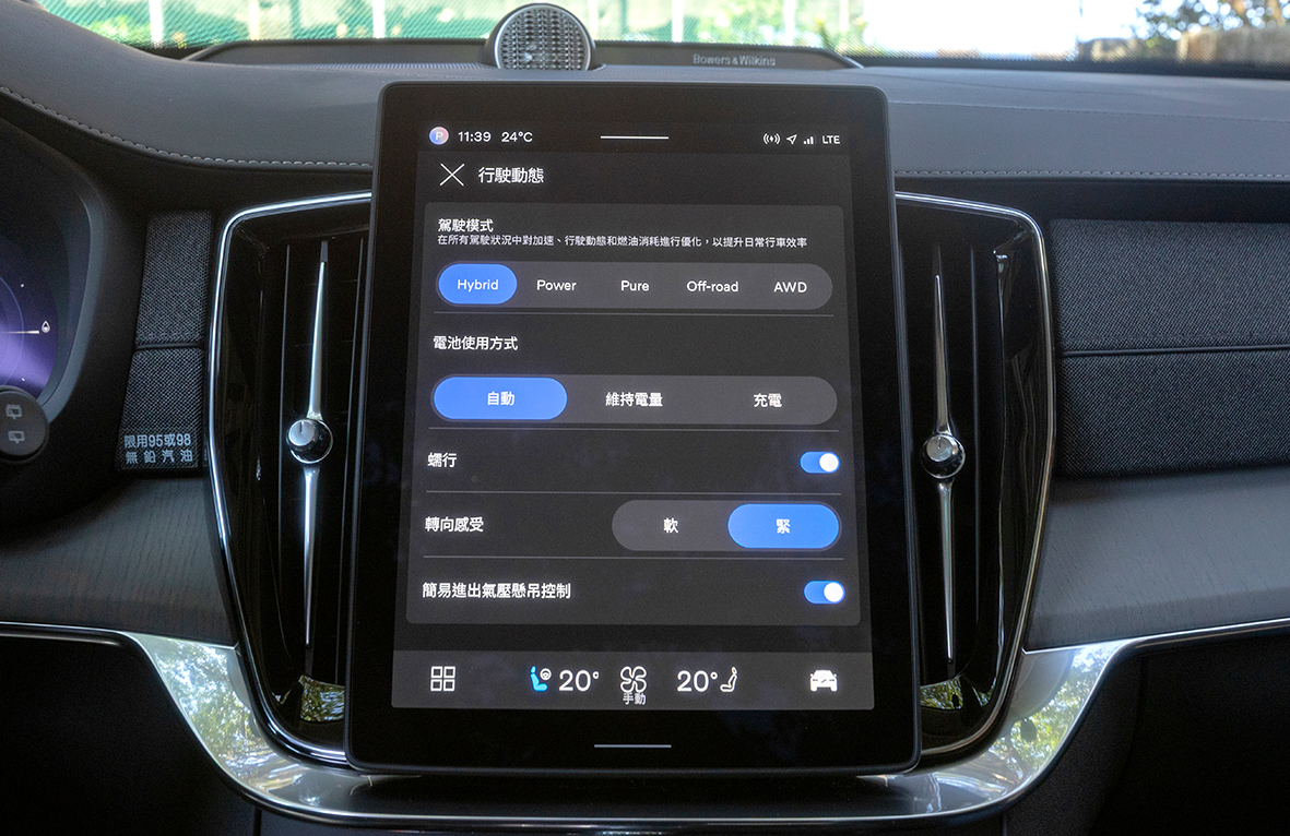 在B5 Plus AWD車型搭載的是FSD頻率感應式阻尼可變系統,但頂規的T8 PHEV AWD車型則是標配更高階的Four-C底盤附氣壓式懸吊系統;這底盤懸吊系統搭配出色的車身剛性與eAWD四輪驅動系統,除了在乘坐舒適上的表現沒話說之外,對於路面震動的抑制處理與車艙隔音等都令人滿意,尤其高速行駛時的穩定性極佳,能給予駕駛十分安心沈穩的駕馭感受;再者,其懸吊過彎時的支撐性比預想中還要出色,加上eAWD四輪驅動所帶來的絕佳循跡性表現,讓此車在山路彎道上有著既靈活且穩定受控的操駕動態,來匹配達455hp馬力的強悍輸出。整個來說,既穩定又好開且有著出色的行路質感以及隨時供驅策的熱血性能,完全符合一部高級豪華旗艦休旅所應有的全方位高水準表現。
