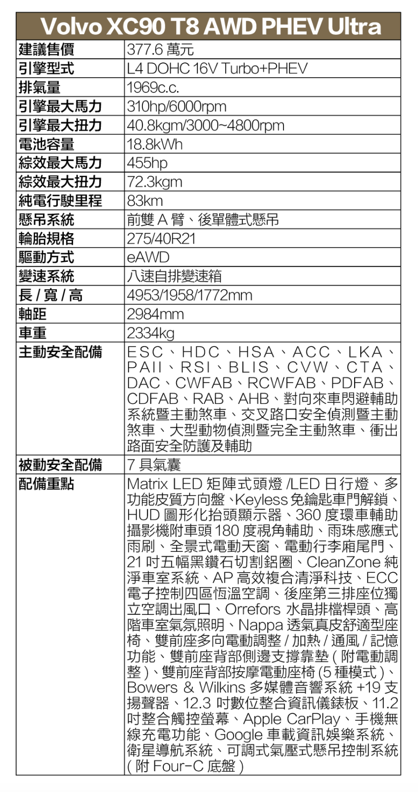 儘管只是二次小改款工程,但對於XC90原廠還是誠意做足,針對了外型、內裝質感、車機科技與車艙乘適性等項目皆全面進行革新升級,而賦予此車更為進階且成熟的產品實力與底氣,以冀望能在國內300萬級距的豪華LSUV市場中持續站穩腳步,有著出色的銷售成績。而目前總代理國際富豪汽車共導入了包括入門的B5 Plus、中階B5 Ultra以及此次所試駕的頂規T8 PHEV等三款車型,正式售價分別為295.6萬、337.1萬以及377.6萬元。