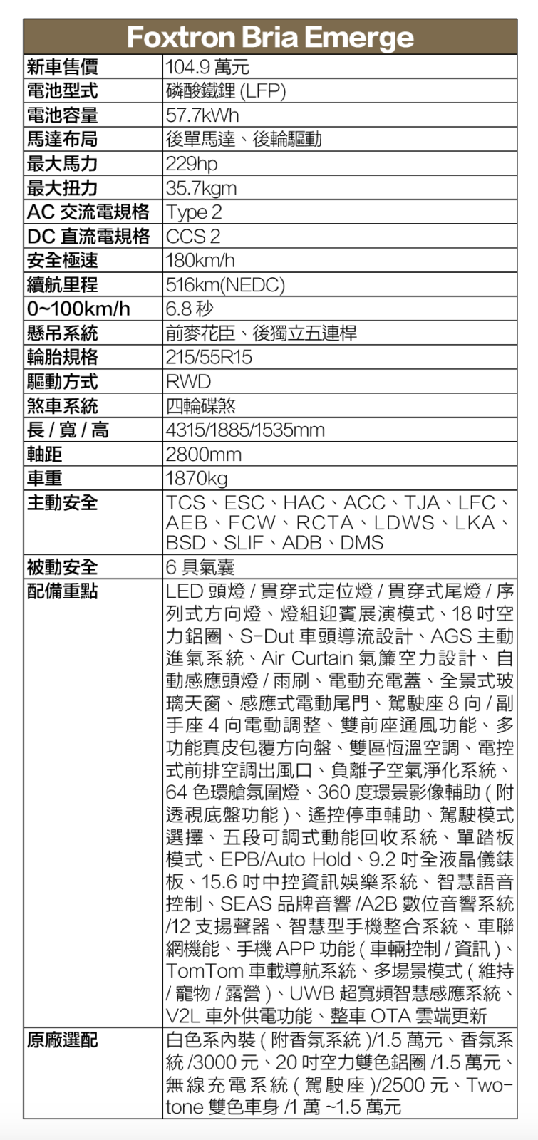 從Bria Emerge整體的產品本質實力來看,確實是一部各方面表現皆相當均衡且有態度的國產電動車,無論是動感流線的身形、科技化的內裝布局與豐富配備,還是寬敞的乘坐空間機能與高規格的主動安全科技,亦或是不俗的動力性能表現等都讓人刮目相看,尤其具有歐系掀背車特質的操控感受更是令人驚艷。因此若各位正在考慮人生第一部電動車的話,Foxtron Bria值得放入你口袋名單。