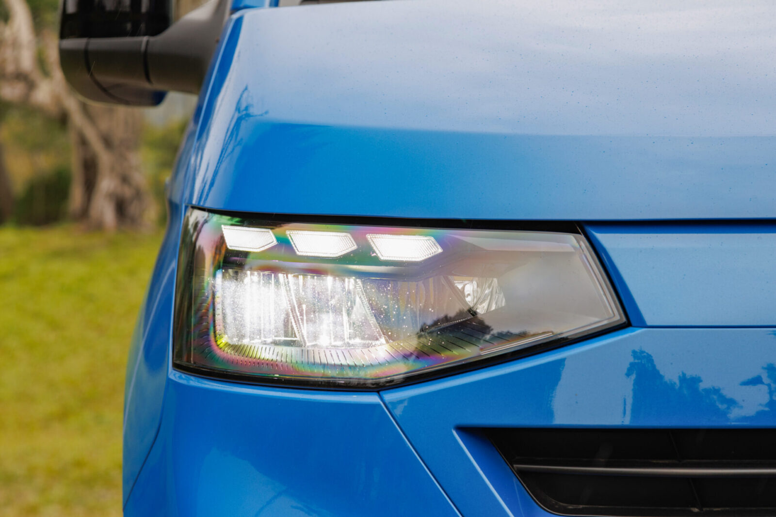 做為新世代商旅車款,T7 Caravelle在包括頭燈、日行燈、全天候燈、方向燈、尾燈等外部照明均採用全LED光源科技,大幅提升辨識度與行車安全性之外,亦充分展現與時俱進的精緻視覺感受;此外,為滿足不同領域、不同喜好的消費者,新車不僅提供沉穩內斂的岩石灰、靛藍、午夜黑與石墨灰等常規色系,也可像是一般乘用車選用更加活潑亮麗的純淨白、烈焰紅、冰銀灰,以及試駕車採用的晴天藍等車色,配合更加立體動感的輪圈樣式,確實跳脫傳統商旅車較為平淡無奇的低調印象。