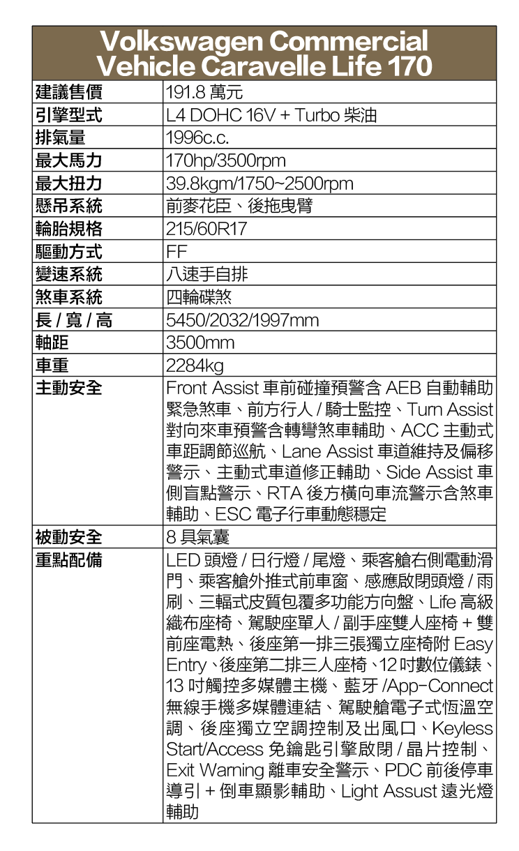 由於福斯商旅與Ford先前的合作協議,全新T7 Caravelle其實是以Ford Tourneo Custom旅行家為基礎所開發,因此新車所搭載的2.0L直四柴油引擎並非過往T6.1世代的Volkswagen TDI系列單元,而是Ford的EcoBlue引擎配置;新車提供Life 150/Life 170雙動力規格,最大輸出分別為150hp/36.7kgm、170hp/39.8kgm,對應八速手自排變速箱,業者亦強調新車具備同級唯一的4Motion四驅系統,能夠根據路況自動分配驅動力,帶來更為平穩從容的行車體驗。