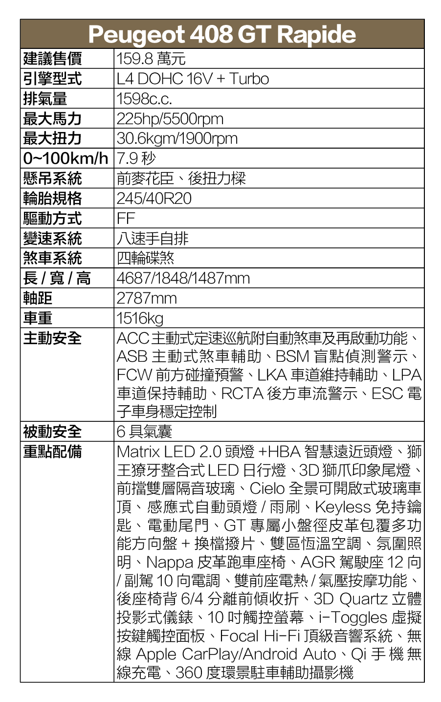 無論是最初引進時的1.2L三缸渦輪、或是去年導入的P2 Hybrid油電動力,對應408的中大型跨界房車車格與約1.5噸的車重,都只能算是夠用、絕對稱不上性能,而此次408 GT Rapide則換上曾蟬聯8屆國際引擎大獎、Peugeot性能車迷相當熟悉的1.6L直四渦輪單元,並採用目前原廠最高的225hp/30.6kgm輸出設定,搭配同樣是老朋友的愛信EAT8八速手自排變速箱,0~100km/h加速比起P2 Hybrid車型縮短1.5秒為7.9秒,極速則可達235km/h。