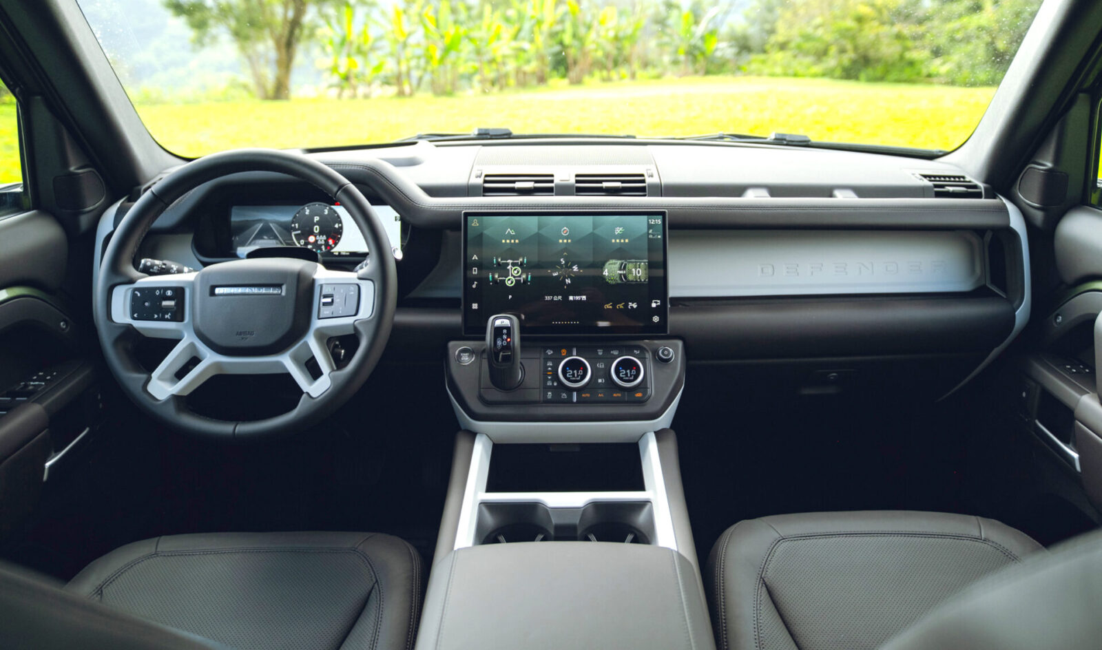 新年式Defender的內裝鋪陳格局並未變動,不過全車系則升級尺碼更大的13 吋曲面多媒體觸控螢幕,並搭配檀木黑塗裝的螢幕邊框來營造高質感氛圍。此外為因應螢幕尺碼的加大,下方懸浮式線傳排檔桿的角度也重新經過調整,讓排檔操作更加直覺且就手。而此螢幕主機除內建衛星導航系統、並完美整合豐富的車載資訊與娛樂等相關功能之外,也能支援Apple CarPlay & Android Auto手機連結功能。其他配備諸如12.3吋全數位化儀錶板、溫莎皮革雙前座14向電動調整座椅(附加熱/通風功能)、Meridian環繞音響、電子車內後視鏡、手機無線充電、360度環景影像輔助/360度停車輔助系統、全景式電動玻璃天窗以及電動尾門等,皆為此次試駕車110 D350 X-Dynamic HSE的標配。另外,此車也再升級選配了包括22吋鋁圈、HUD抬頭顯示器、以及三區恆溫空調/空氣品質偵測功能/進階車室負離子系統等共計26萬元的配備套件,使其總車價來到391萬元。