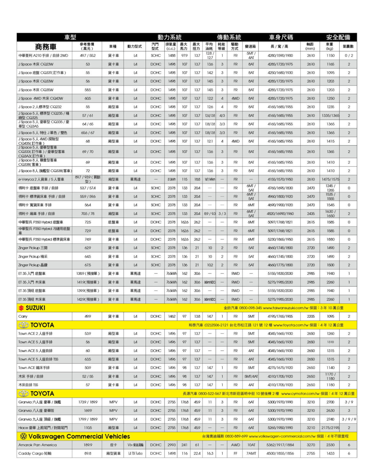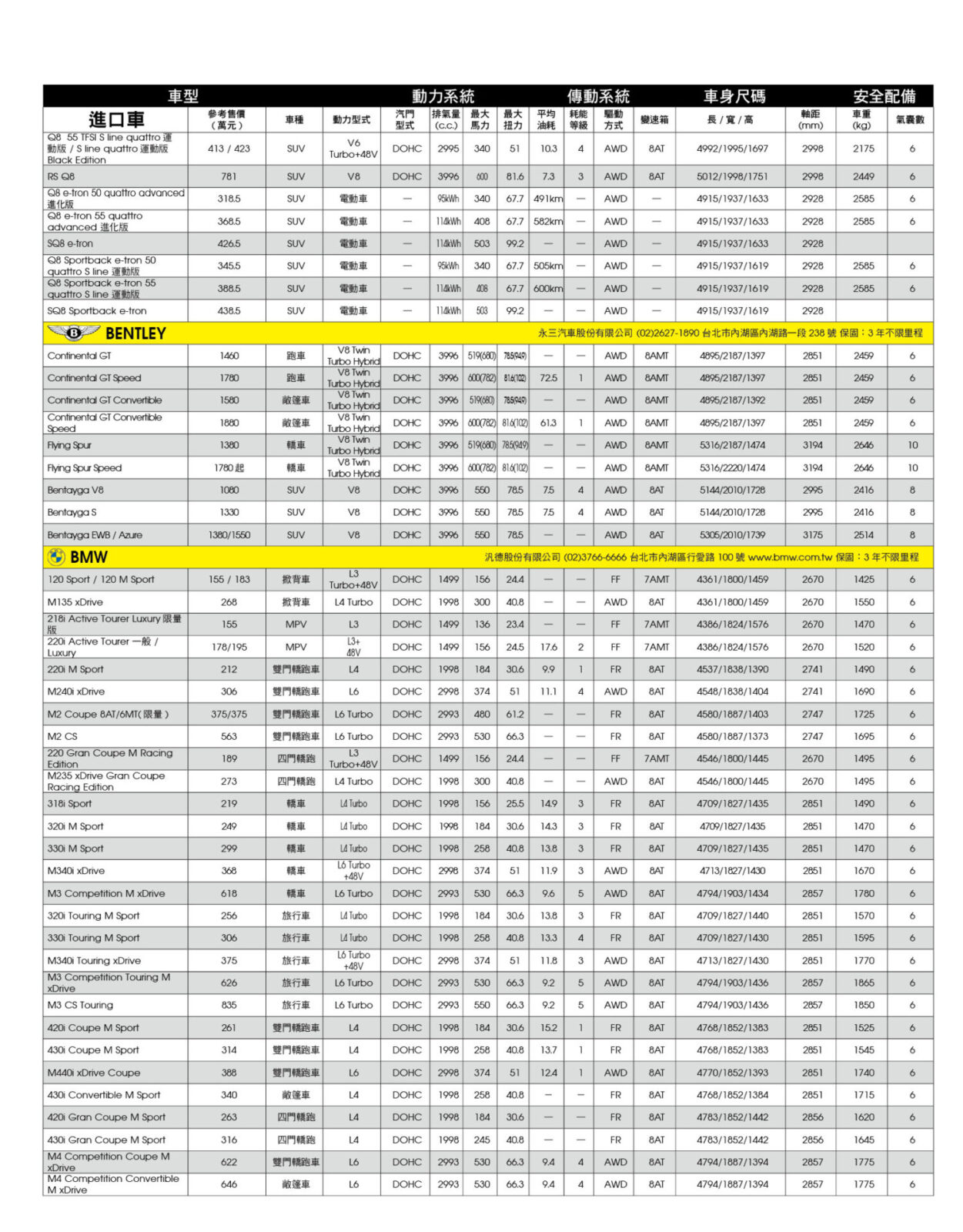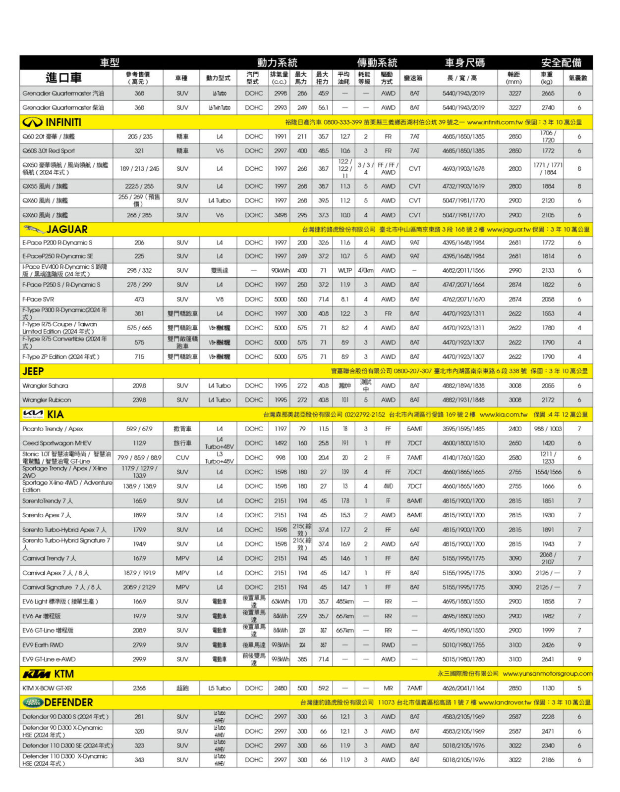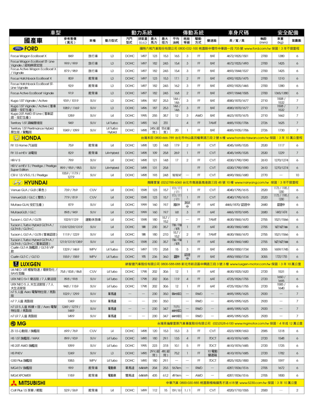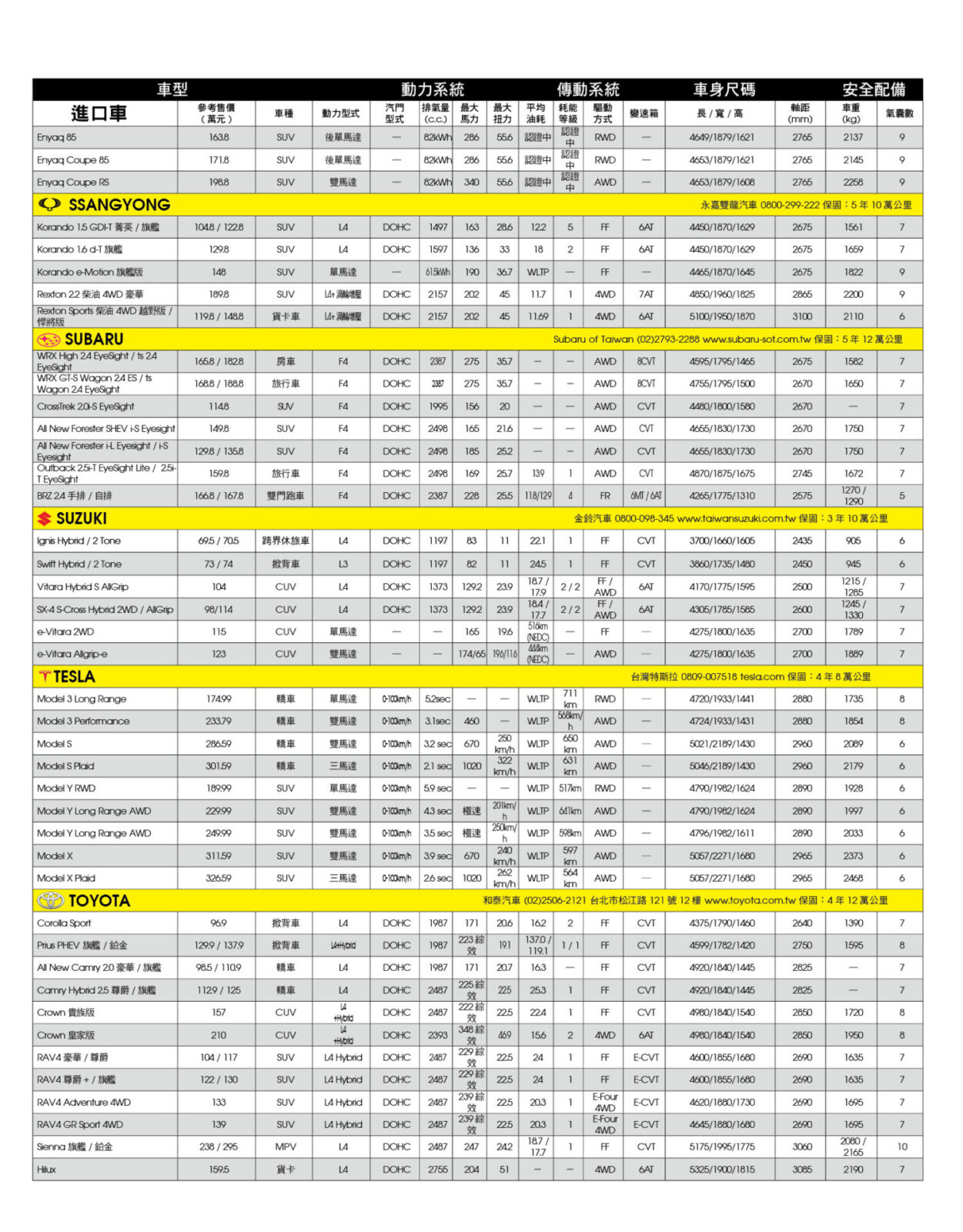 新車售價規格表