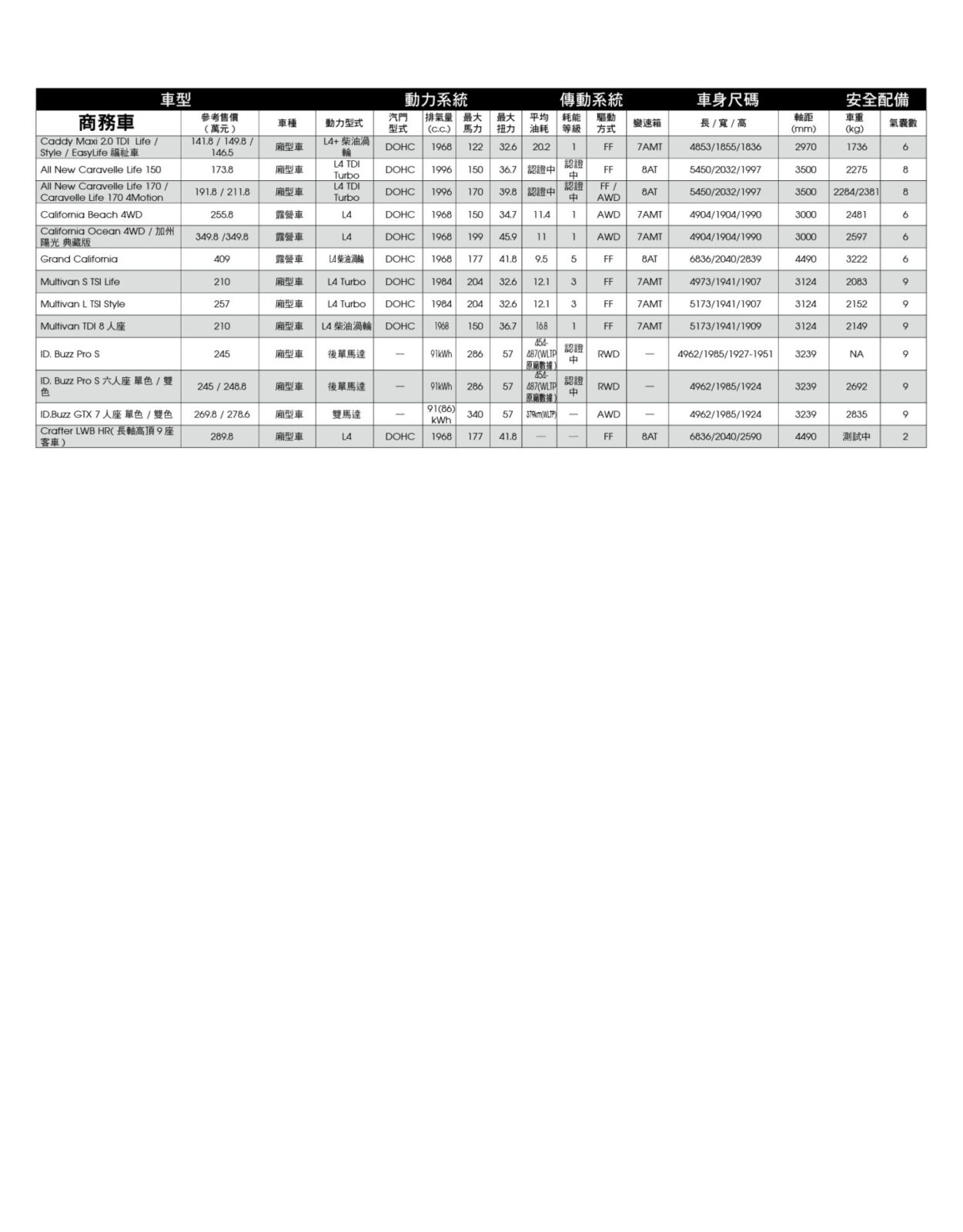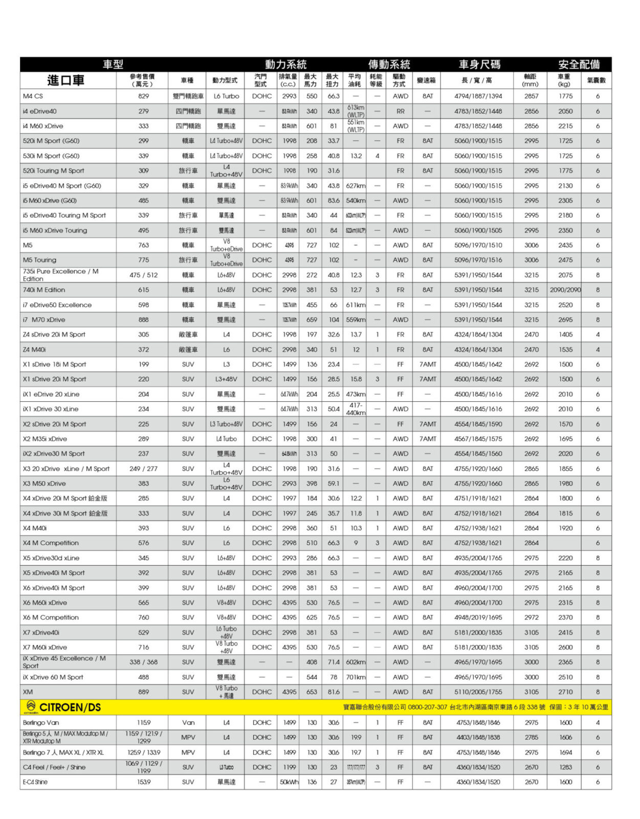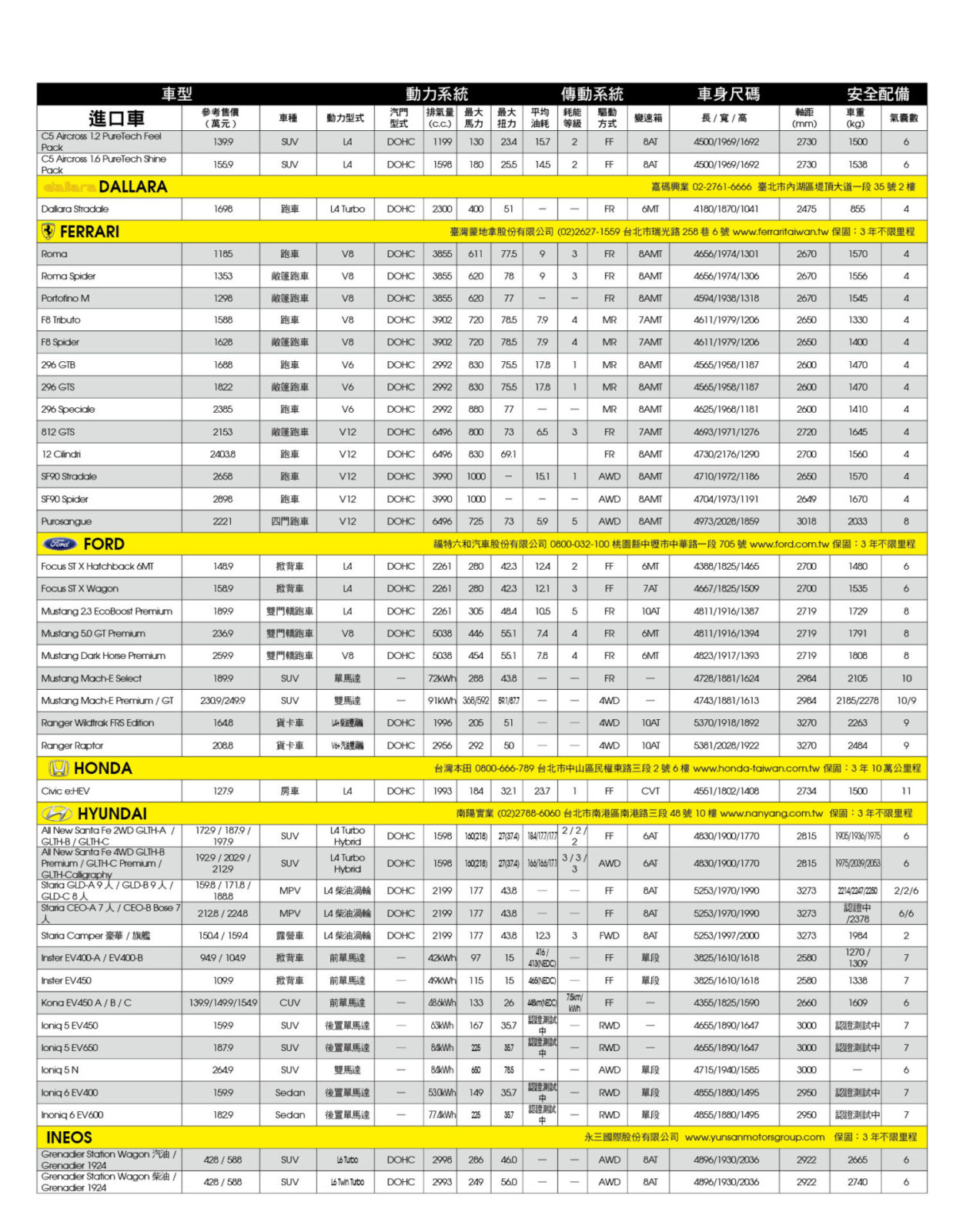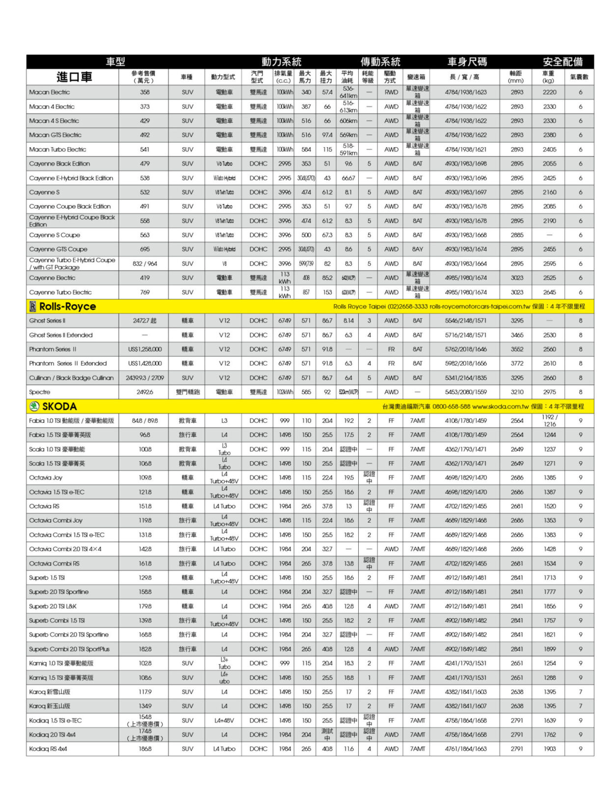 新車售價規格表
