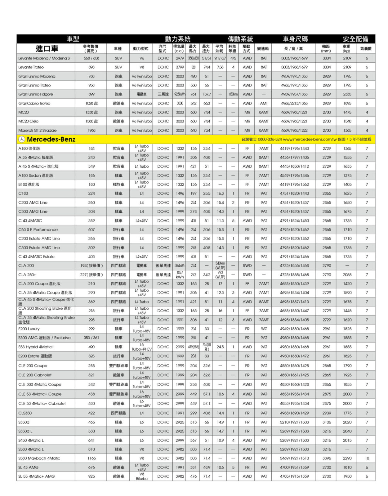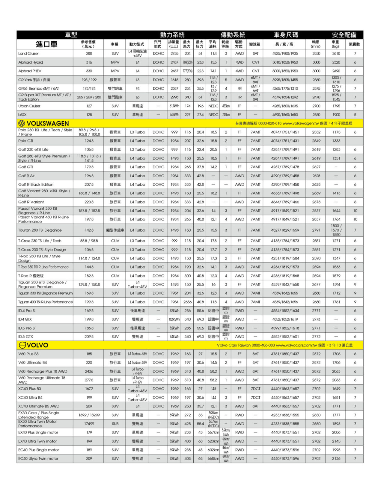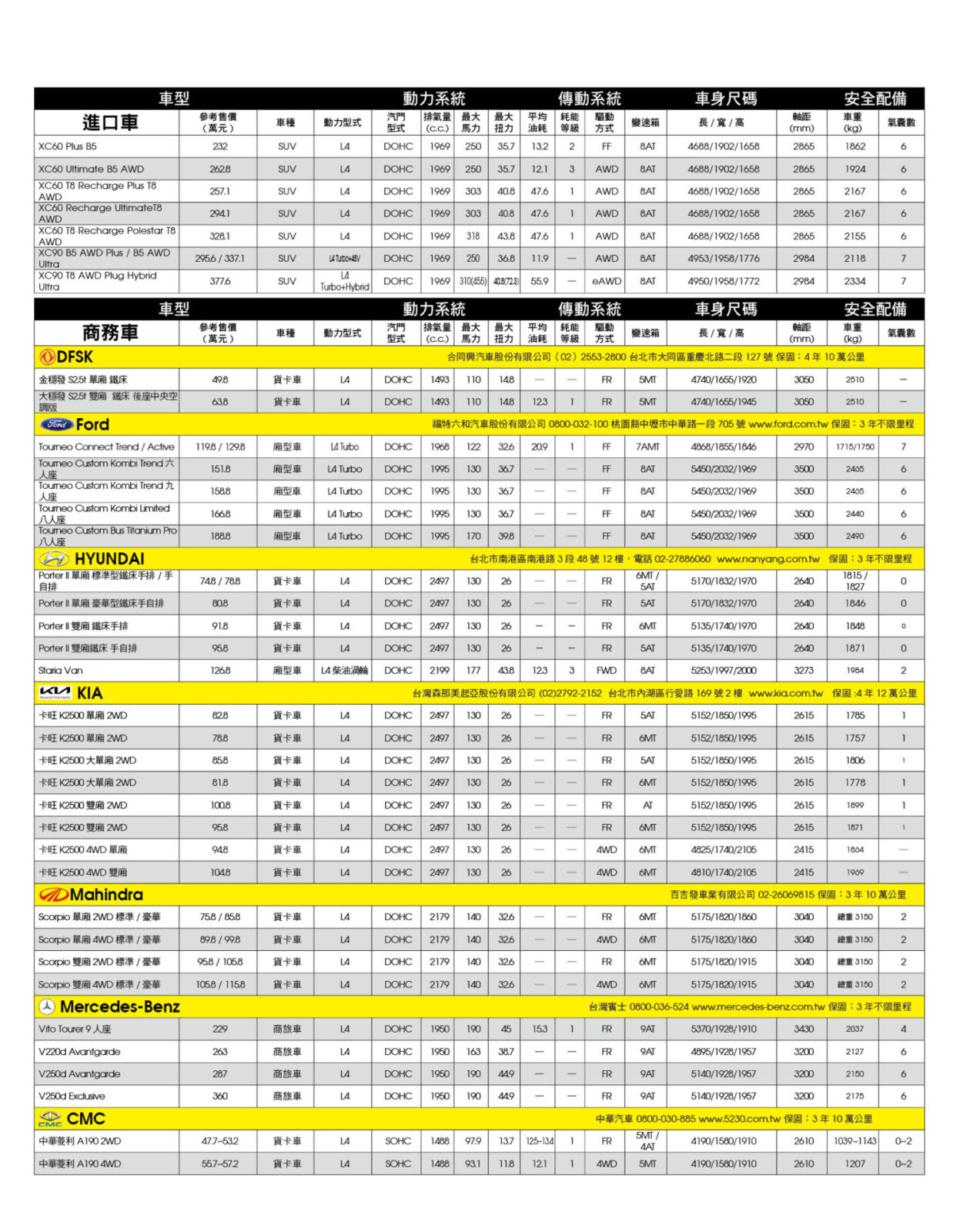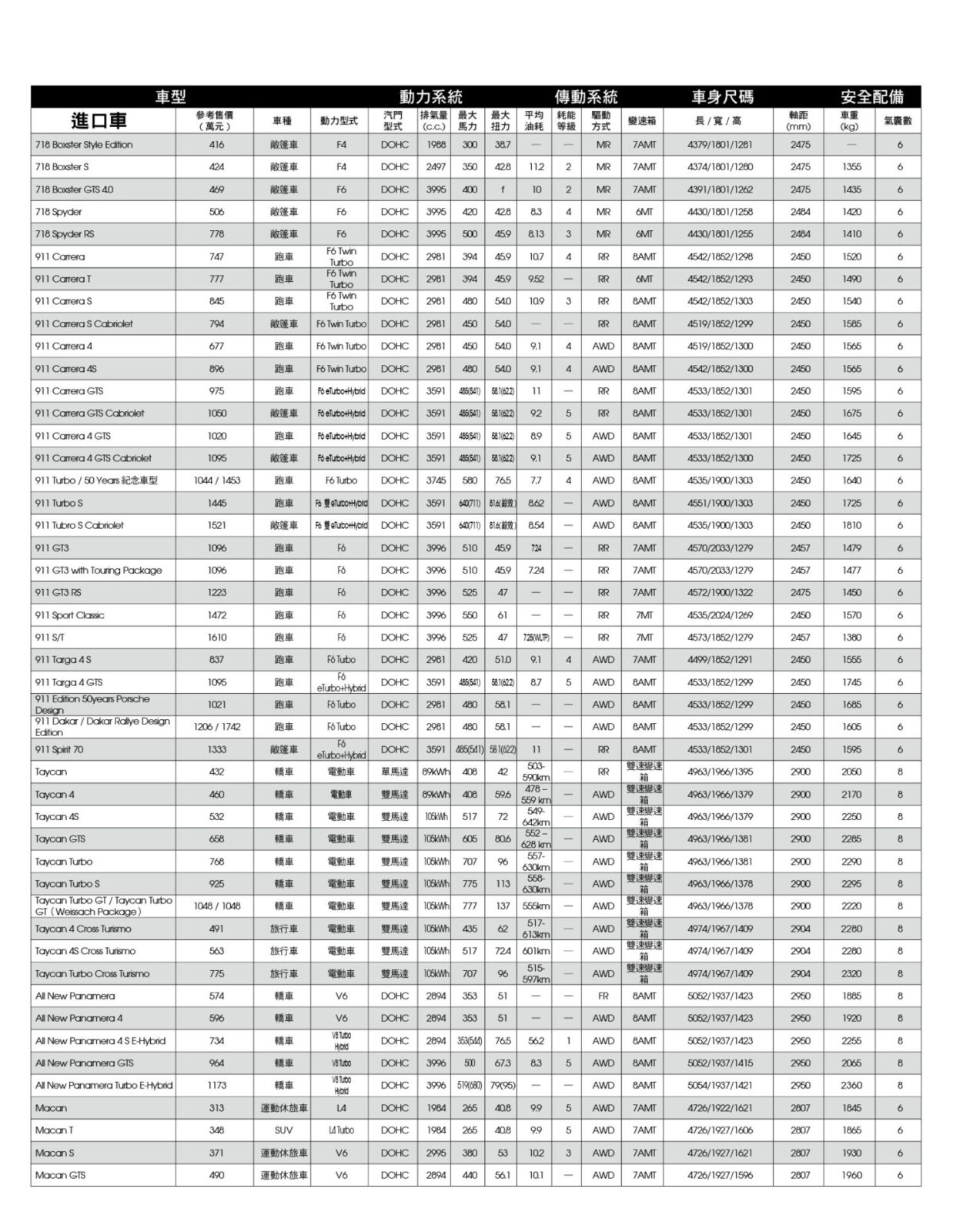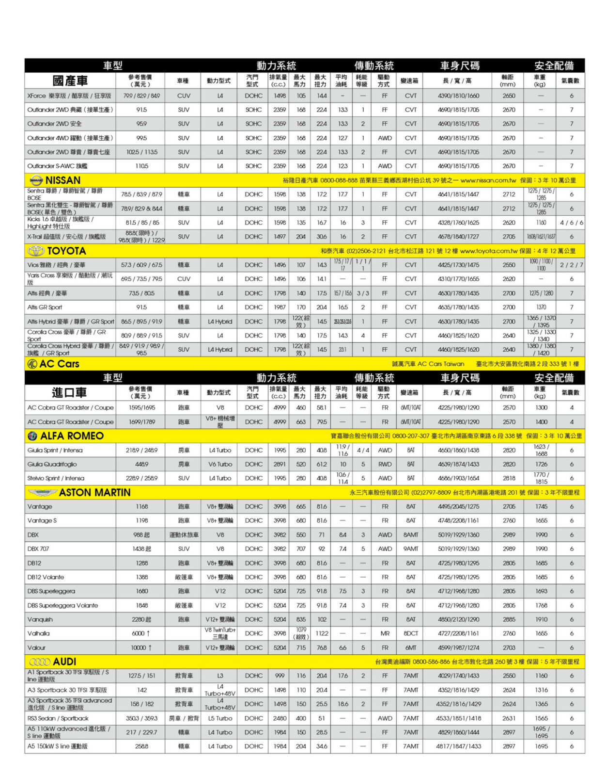 新車售價規格表