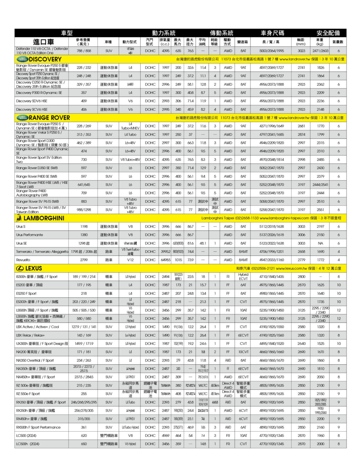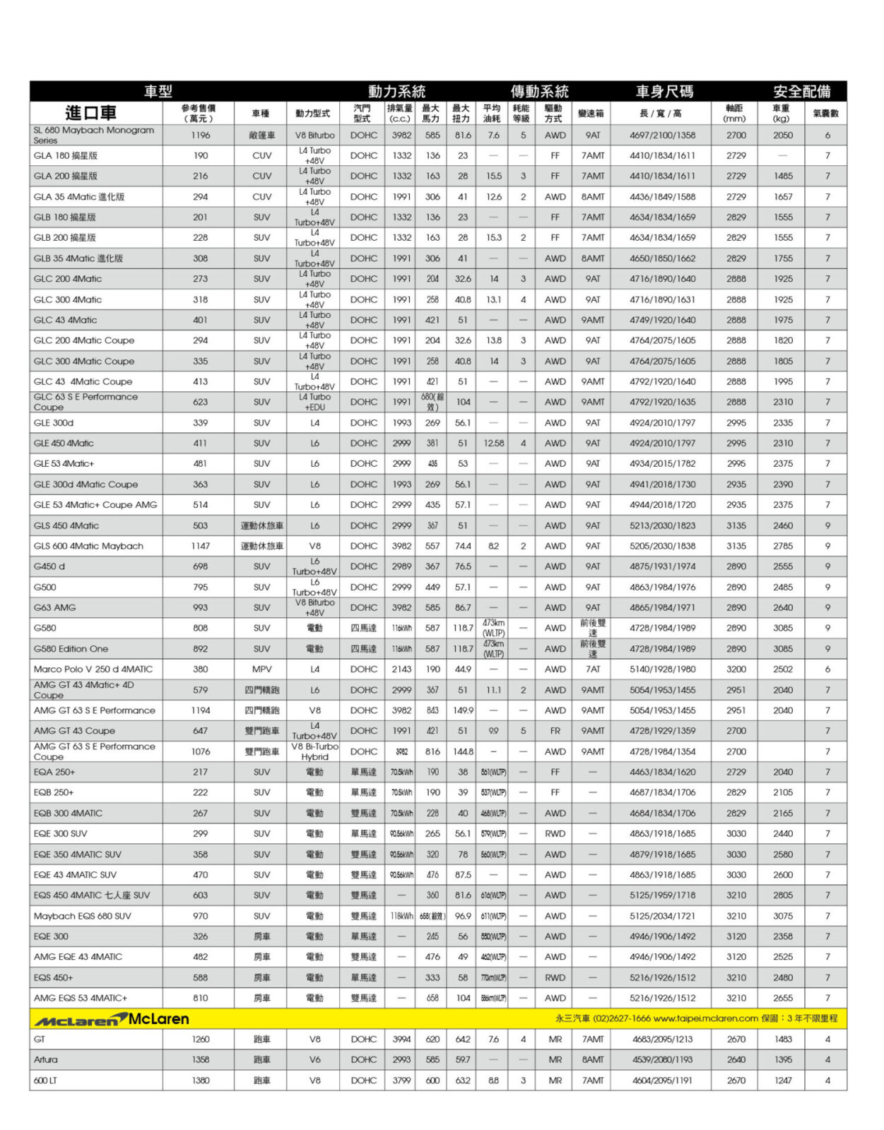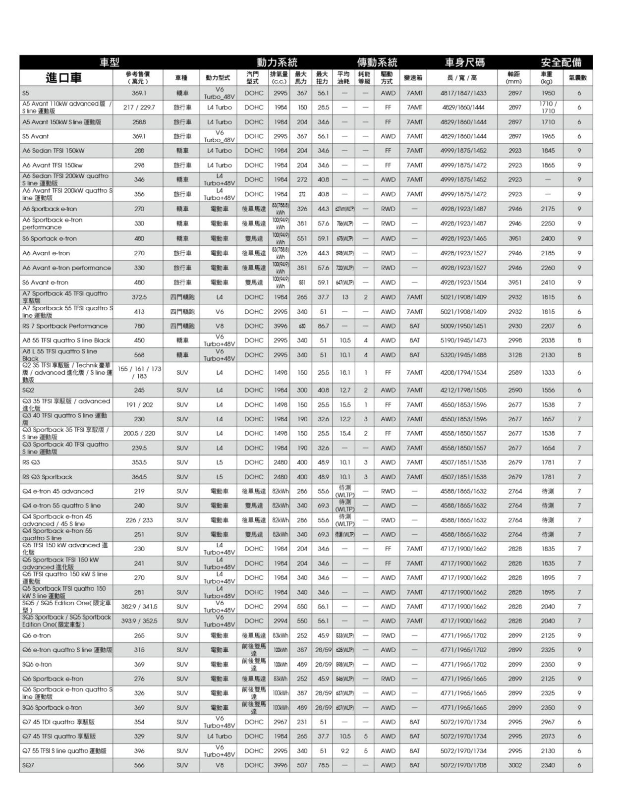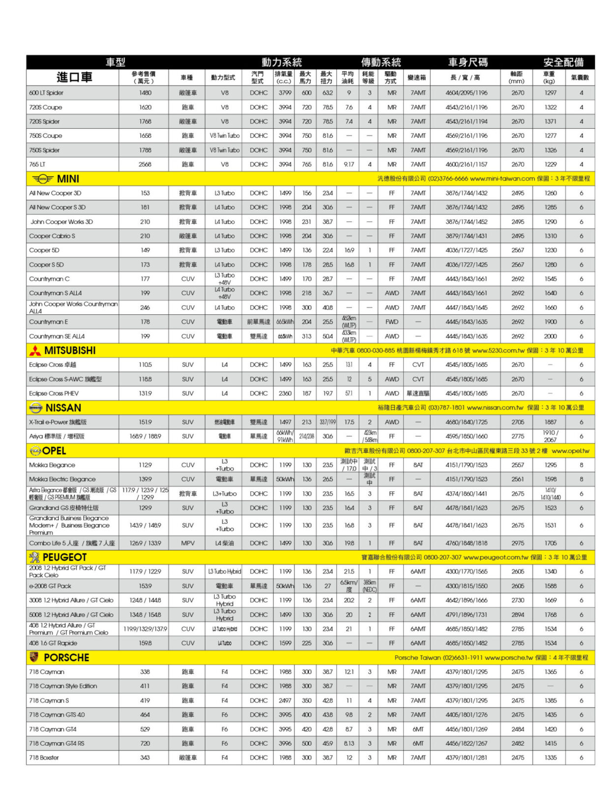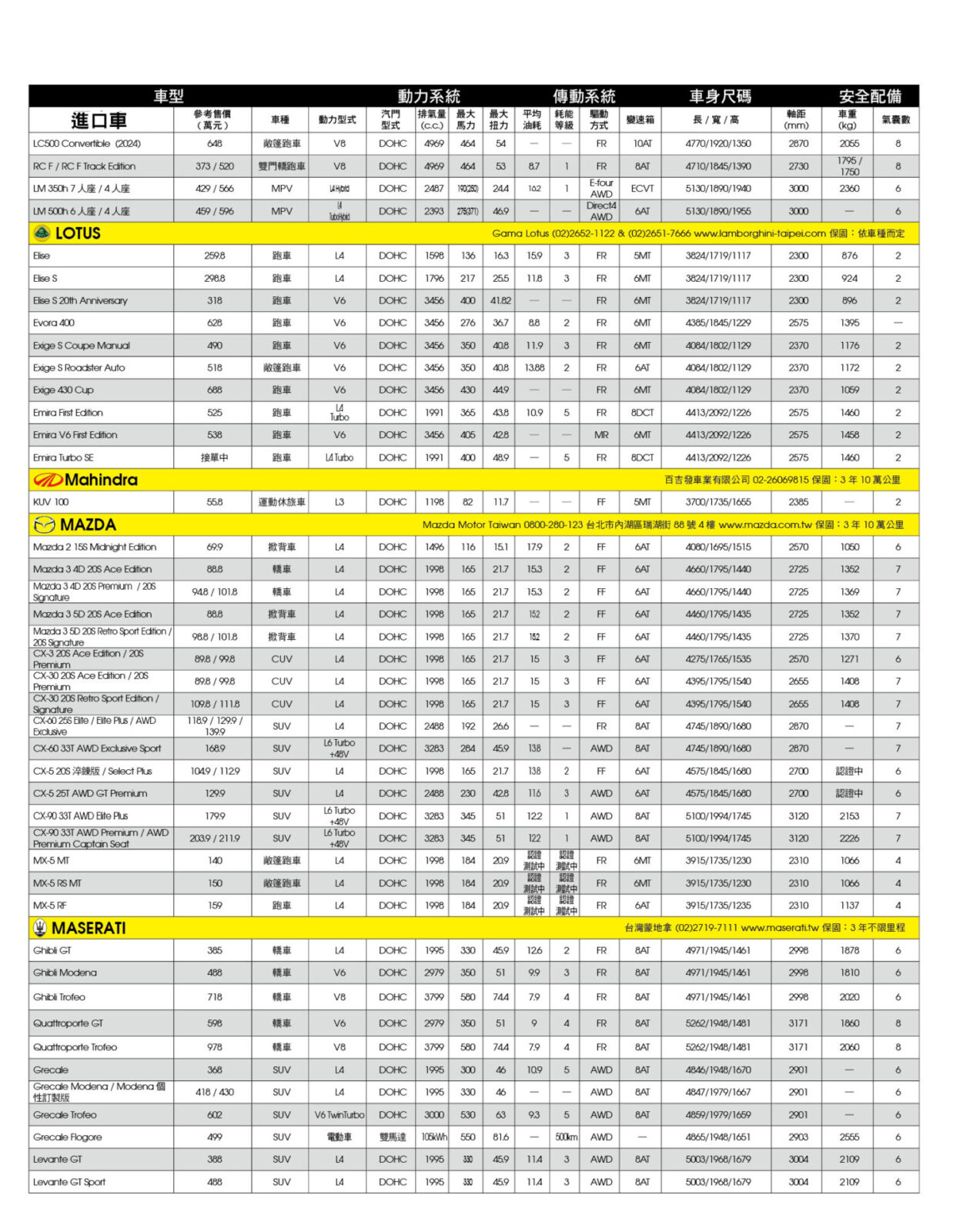 新車售價規格表