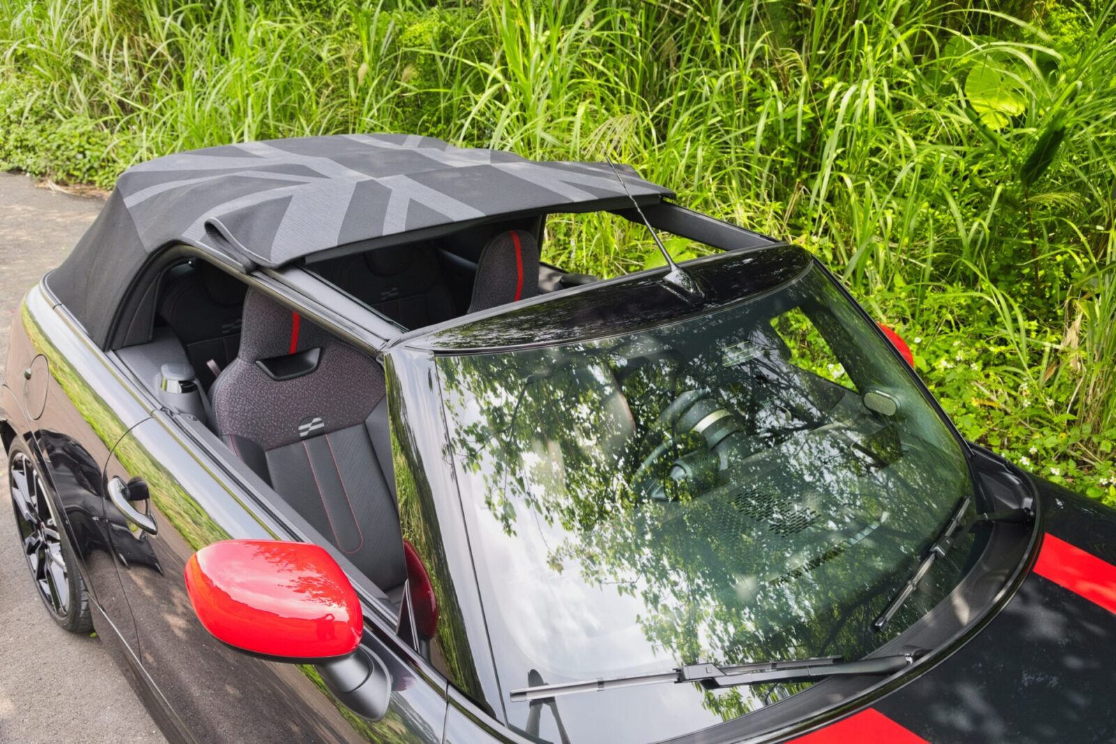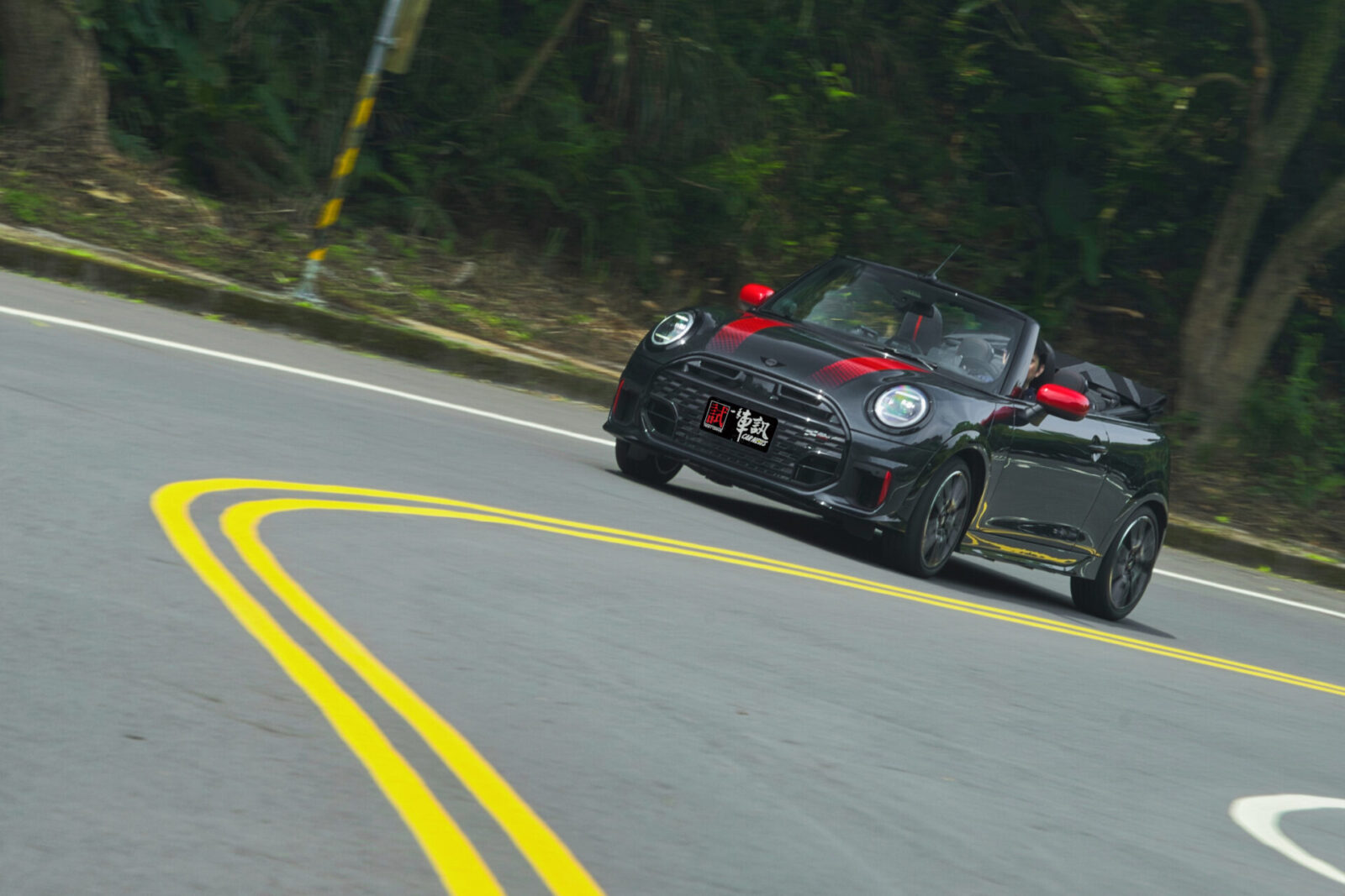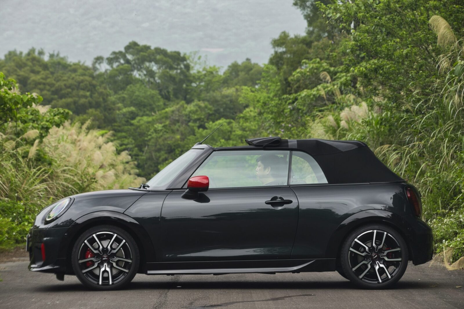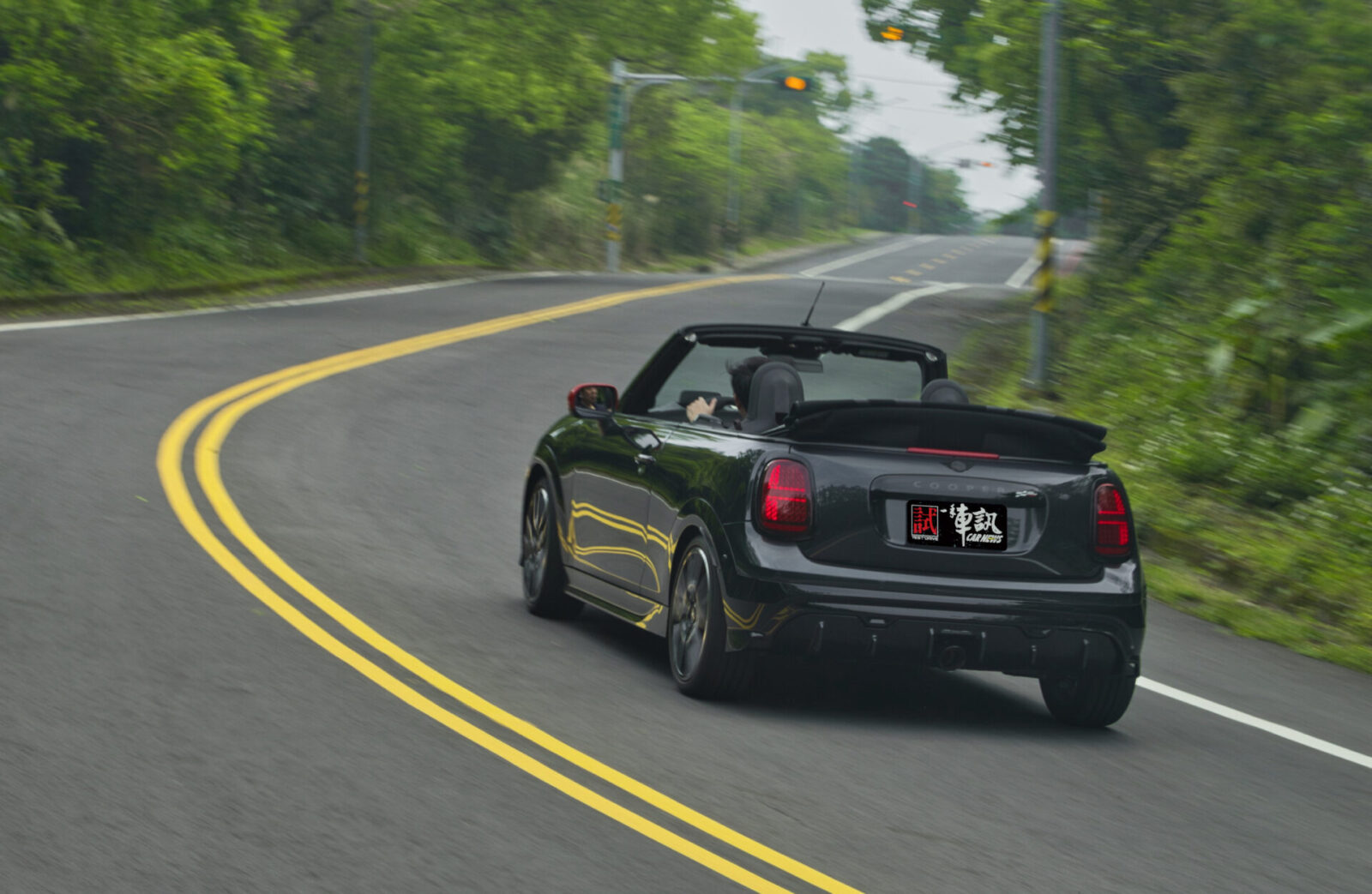 不知道是業者刻意為之還是單純巧合,此次Mini JCW Cabrio媒體試駕車與先前試駕的三門掀背版本同樣採用深鐵灰車色,配上格外顯眼的引擎蓋紅色條紋與紅色後視鏡,但由於少了三門版本的紅色車頂、以及移至前擋頂端的天線,無論頂篷開啟與否都能清楚認出本車獨特的敞篷身份,同時Cabrio在車尾與尾燈部分皆延續前代車型的圓潤線條風格,所呈現出的視覺感受也與追求銳利扁平折線的三門版本大異其趣。當然,本車最大重點還是落在帶有英國旗條紋的電動軟篷上,除了在30km/h以下可於18秒內完成啟閉之外,還提供僅有前段開啟的天窗模式,讓車主自由選擇想要的開闊程度。