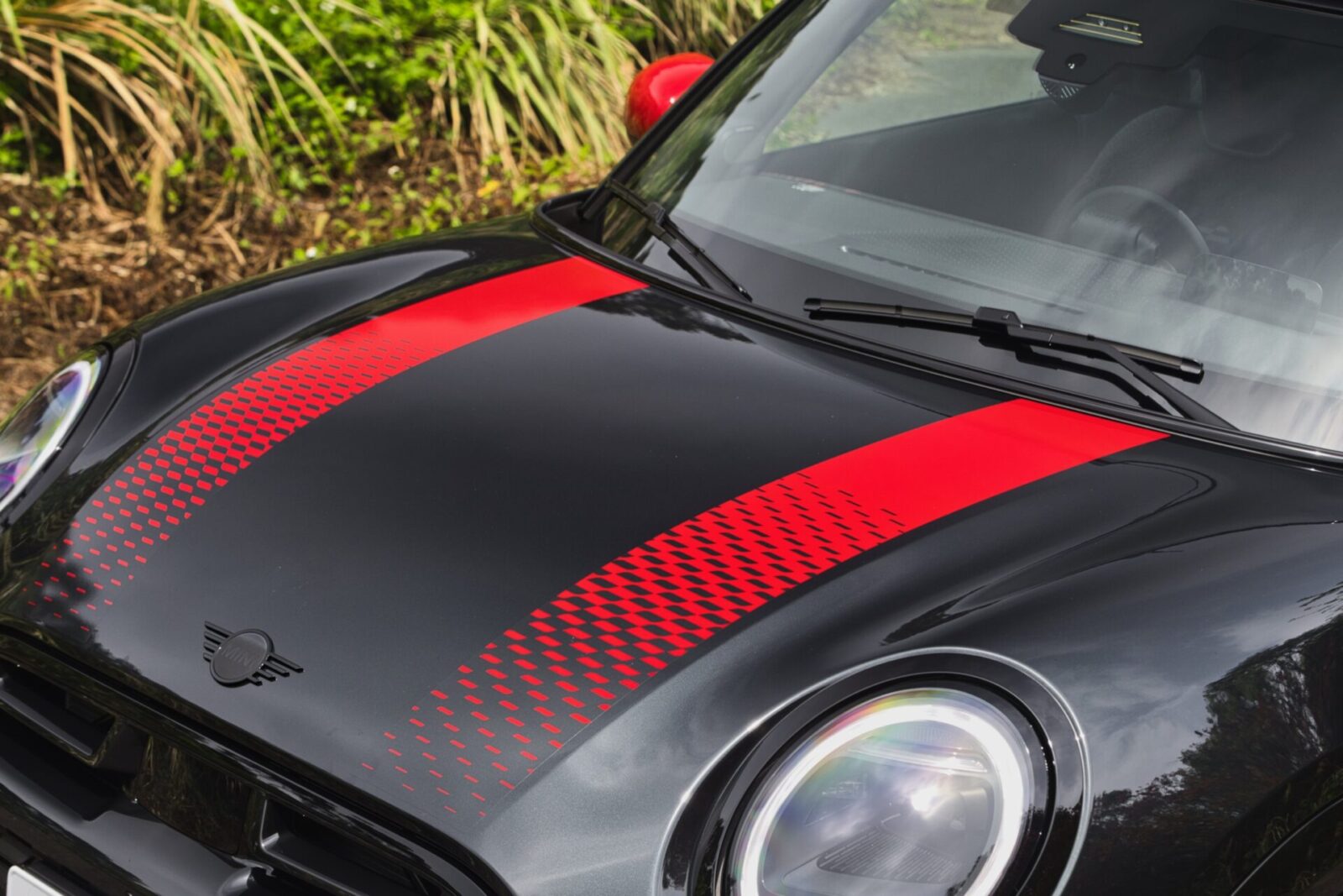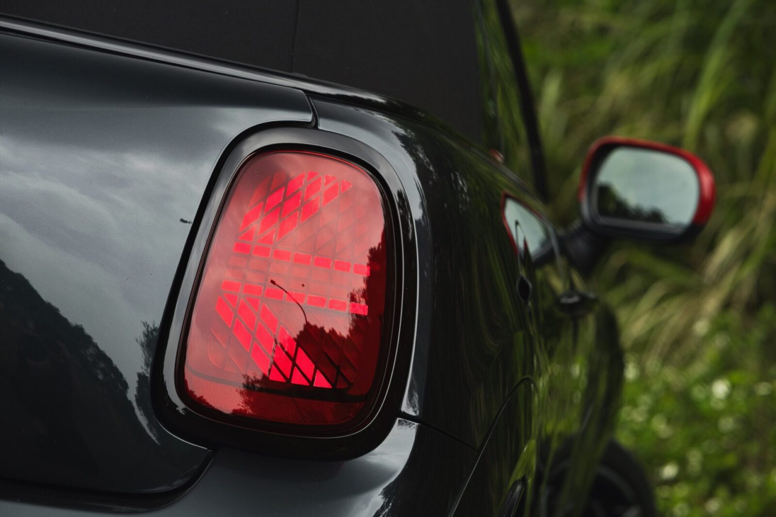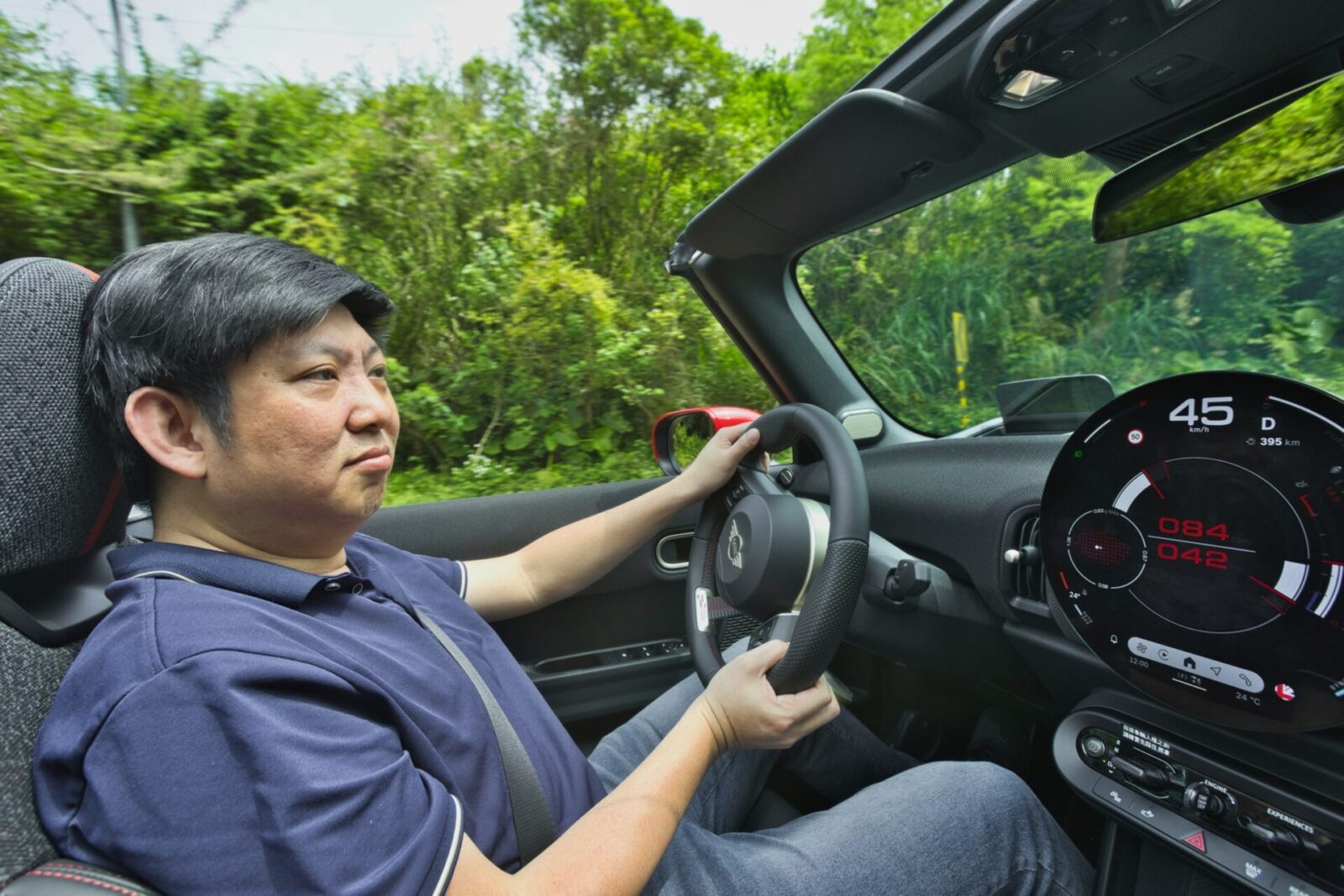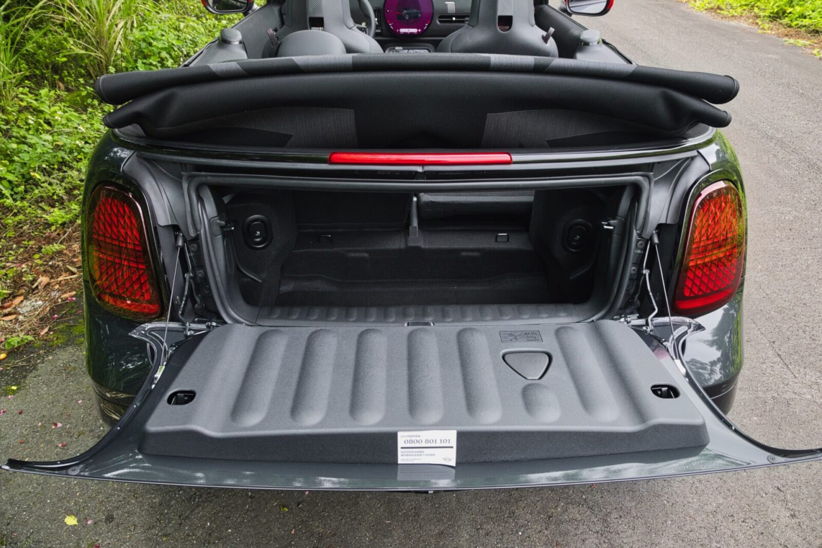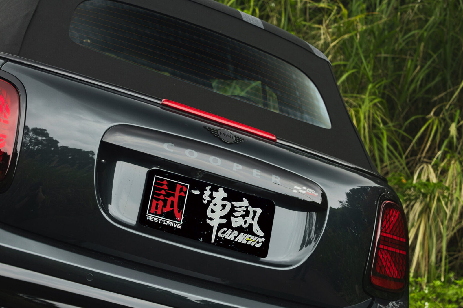 不知道是業者刻意為之還是單純巧合,此次Mini JCW Cabrio媒體試駕車與先前試駕的三門掀背版本同樣採用深鐵灰車色,配上格外顯眼的引擎蓋紅色條紋與紅色後視鏡,但由於少了三門版本的紅色車頂、以及移至前擋頂端的天線,無論頂篷開啟與否都能清楚認出本車獨特的敞篷身份,同時Cabrio在車尾與尾燈部分皆延續前代車型的圓潤線條風格,所呈現出的視覺感受也與追求銳利扁平折線的三門版本大異其趣。當然,本車最大重點還是落在帶有英國旗條紋的電動軟篷上,除了在30km/h以下可於18秒內完成啟閉之外,還提供僅有前段開啟的天窗模式,讓車主自由選擇想要的開闊程度。
